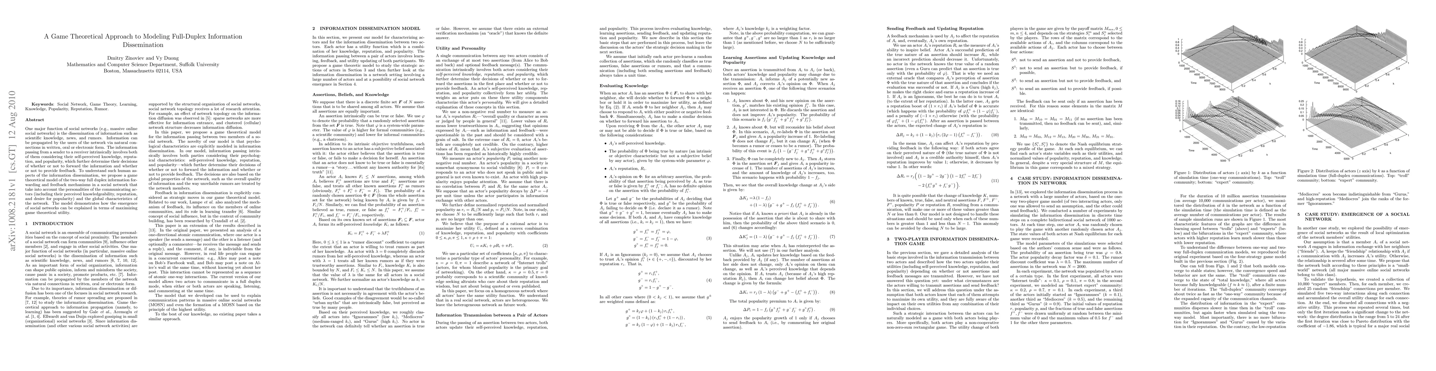 This paper proposes a game theoretical model to analyze the dynamics of full-duplex information dissemination in social networks, considering users' perceived knowledge, reputation, and popularity. The study demonstrates how social networks emerge through utility maximization based on these factors.