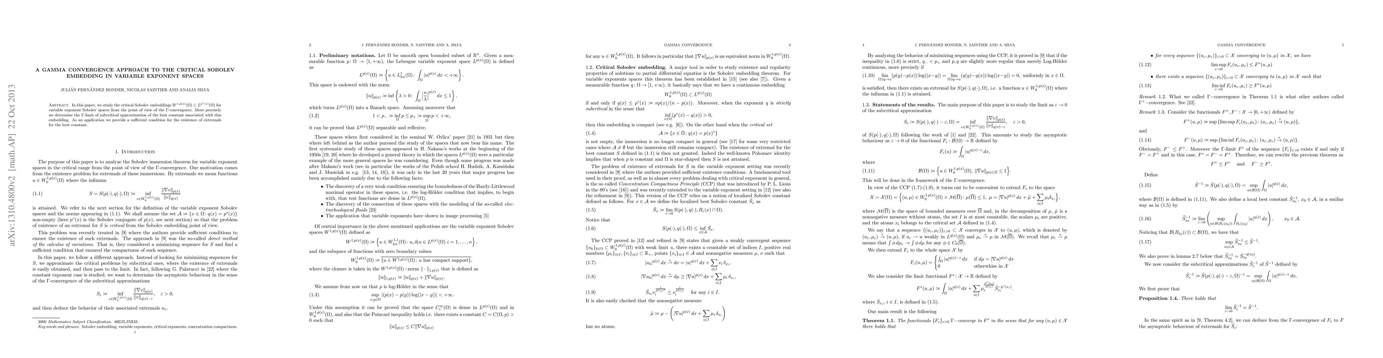 This paper investigates the critical Sobolev embeddings in variable exponent spaces using $\Gamma$-convergence, determining the $\Gamma$-limit of subcritical approximations of the best constant. It also provides a sufficient condition for the existence of extremals for the best constant.
