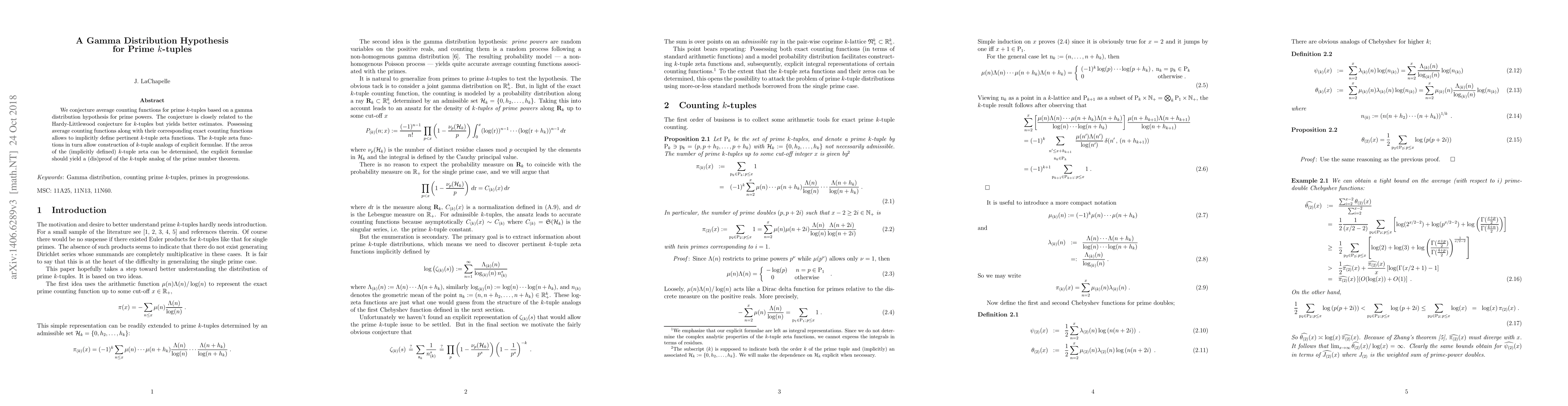 This paper proposes a gamma distribution hypothesis for prime $k$-tuples, offering improved estimates over the Hardy-Littlewood conjecture. It introduces $k$-tuple zeta functions and suggests that determining their zeros could lead to a proof or disproof of the $k$-tuple analog of the prime number theorem.