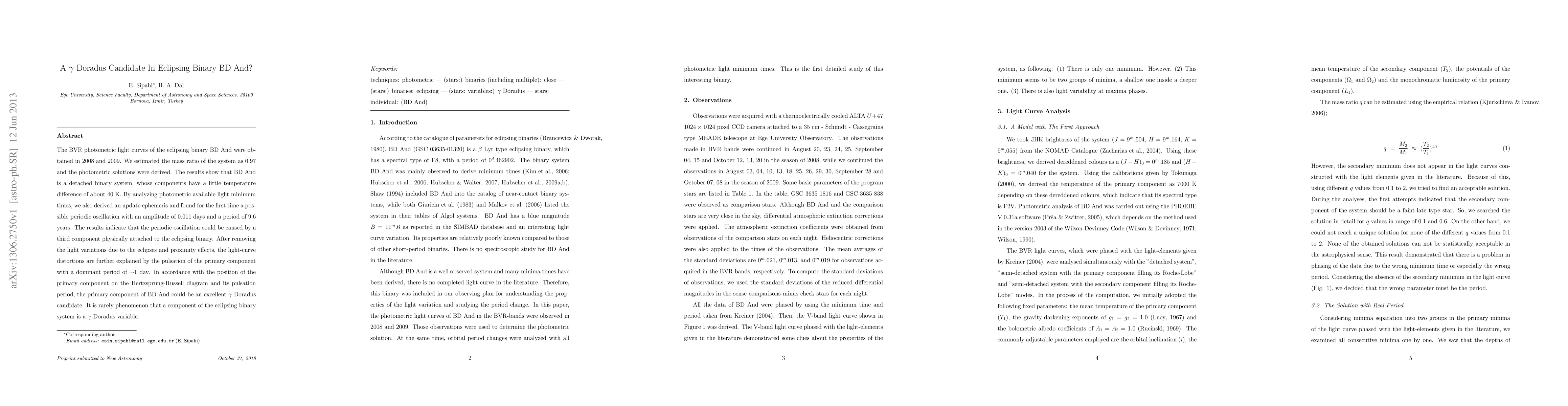 The eclipsing binary BD And exhibits a detached system with a mass ratio of 0.97, and its primary component shows light-curve distortions suggesting it may be a gamma Doradus variable. The system also displays a possible periodic oscillation indicative of a third component, with a dominant pulsation period of 1 day.