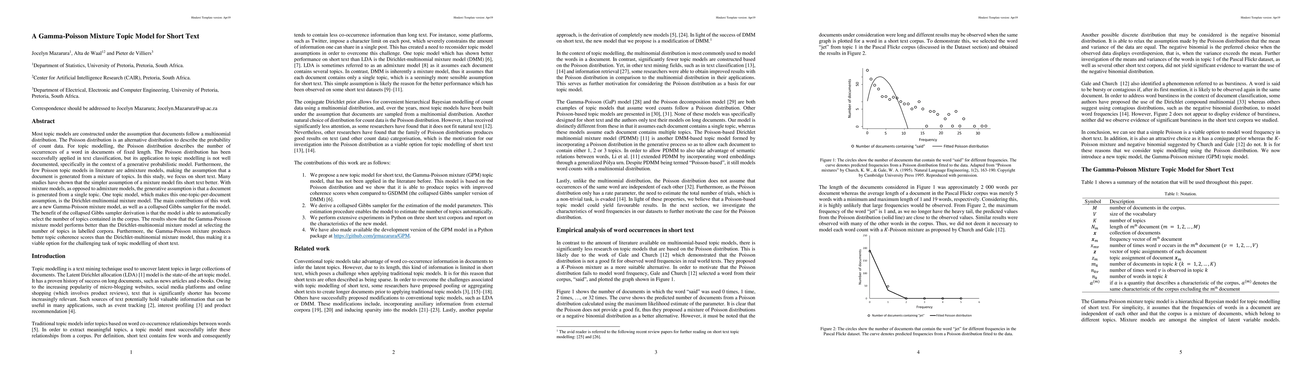 This paper proposes a Gamma-Poisson mixture topic model for short text, introducing a new generative probabilistic model that outperforms the Dirichlet-multinomial mixture model in topic coherence and automatic topic selection. The study also presents a collapsed Gibbs sampler for efficient model inference.