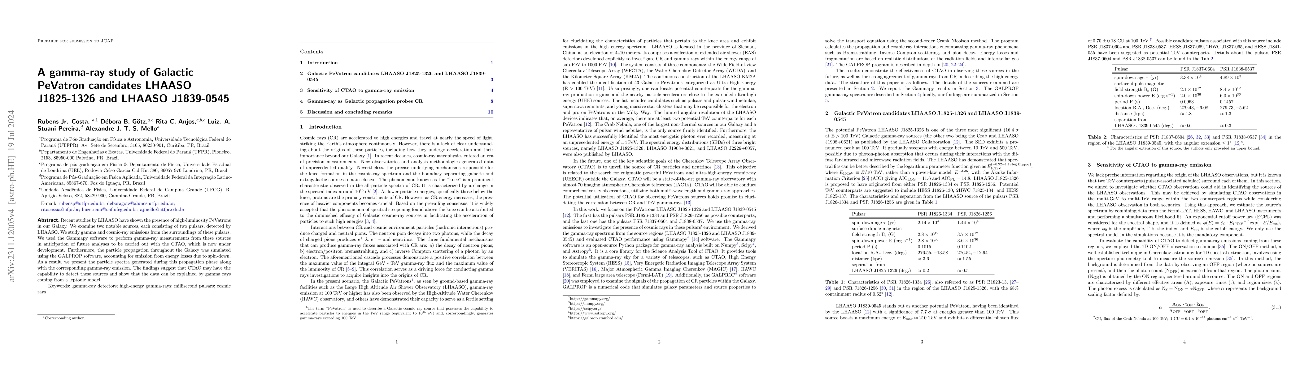 The study investigates two high-luminosity PeVatron candidates detected by LHAASO, analyzing their gamma and cosmic-ray emissions using Gammapy and simulating particle propagation with GALPROP. The results indicate that the CTA observatory may detect these sources and support a leptonic model for the gamma-ray emissions.