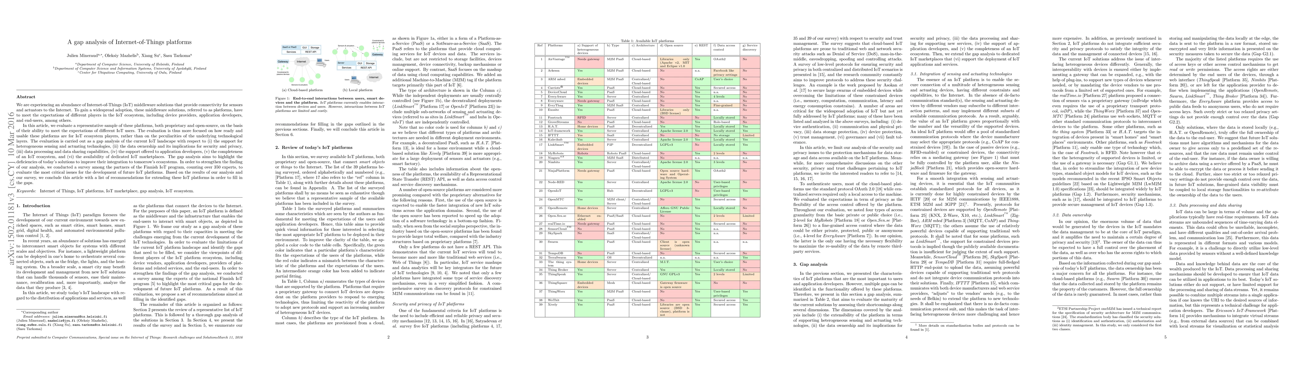 This paper conducts a gap analysis of various Internet-of-Things (IoT) platforms, assessing their readiness to meet the needs of different IoT ecosystem players. The analysis highlights deficiencies in support for heterogeneous technologies, data ownership, processing, developer support, ecosystem completeness, and marketplace availability, aiming to improve future IoT platform integration.