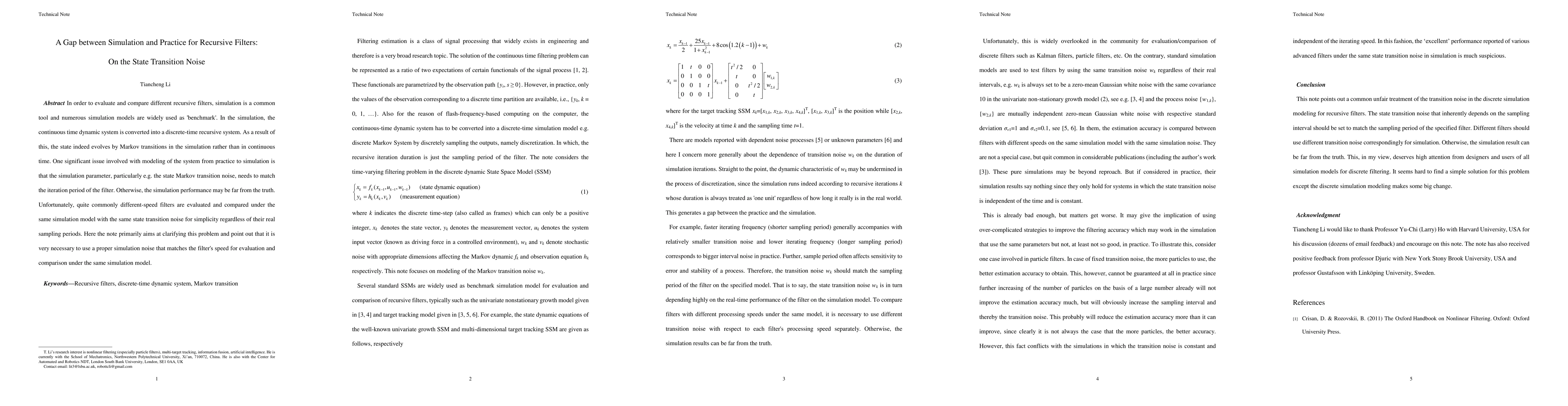 In order to evaluate and compare different recursive filters, simulation is a common tool and numerous simulation models are widely used as 'benchmark'. In the simulation, the continuous time dynamic system is converted into a discrete-time recursive system. As a result of this, the state indeed evolves by Markov transitions in the simulation rather than in continuous time. One significant issue involved with modeling of the system from practice to simulation is that the simulation parameter, particularly e.g. the state Markov transition noise, needs to match the iteration period of the filter. Otherwise, the simulation performance may be far from the truth. Unfortunately, quite commonly different-speed filters are evaluated and compared under the same simulation model with the same state transition noise for simplicity regardless of their real sampling periods. Here the note primarily aims at clarifying this problem and point out that it is very necessary to use a proper simulation noise that matches the filter's speed for evaluation and comparison under the same simulation model.