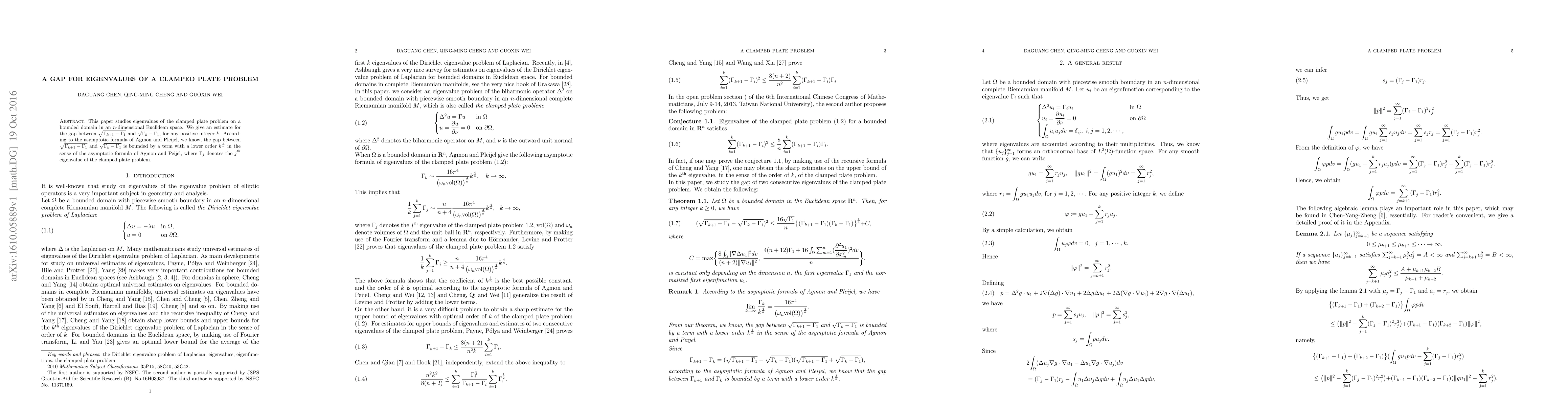 This paper studies eigenvalues of the clamped plate problem on a bounded domain in an $n$-dimensional Euclidean space. We give an estimate for the gap between $\sqrt {\Gamma_{k+1}-\Gamma_{1}}$ and $\sqrt {\Gamma_{k}-\Gamma_{1}}$, for any positive integer $k$. According to the asymptotic formula of Agmon and Pleijel, we know, the gap between $\sqrt {\Gamma_{k+1}-\Gamma_{1}}$ and $\sqrt {\Gamma_{k}-\Gamma_{1}}$ is bounded by a term with a lower order $k^{\frac1n}$ in the sense of the asymptotic formula of Agmon and Peijel, where $\Gamma_j$ denotes the $j^{^{\text{th}}}$ eigenvalue of the clamped plate problem.