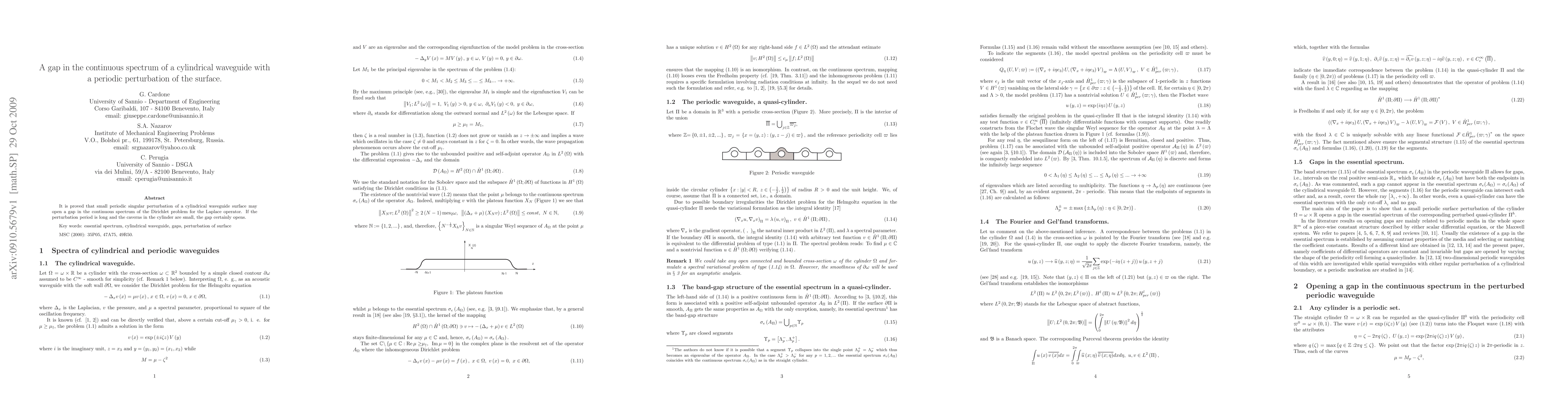 Summary: This paper demonstrates that a small periodic surface perturbation of a cylindrical waveguide can create a gap in the continuous spectrum of the Dirichlet problem for the Laplace operator. Specifically, when the perturbation period is sufficiently long and the caverns are small, a spectral gap is guaranteed to form.