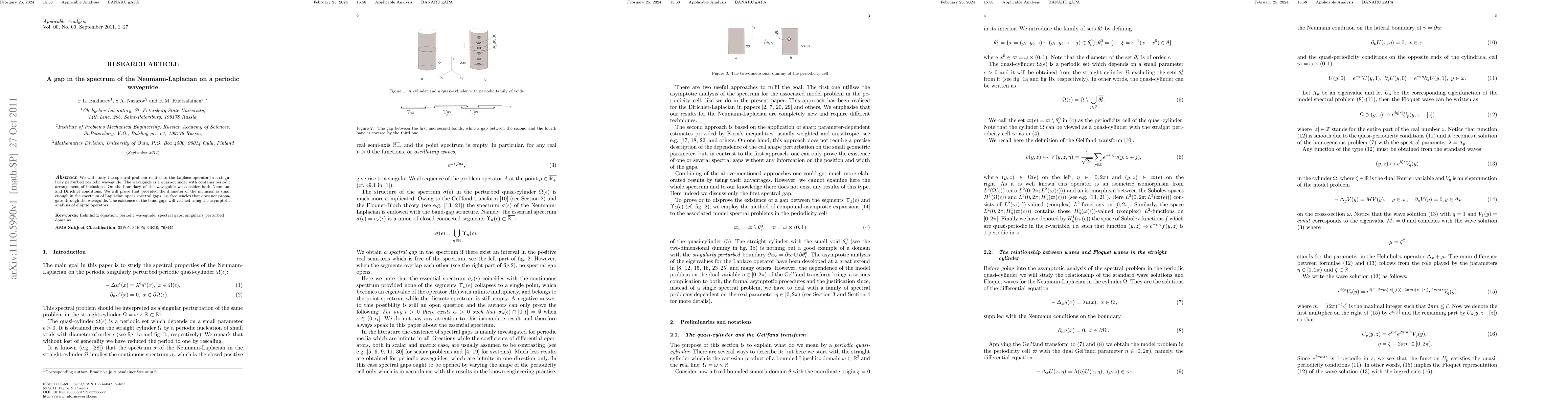 We will study the spectral problem related to the Laplace operator in a singularly perturbed periodic waveguide. The waveguide is a quasi-cylinder with contains periodic arrangement of inclusions. On the boundary of the waveguide we consider both Neumann and Dirichlet conditions. We will prove that provided the diameter of the inclusion is small enough in the spectrum of Laplacian opens spectral gaps, i.e. frequencies that does not propagate through the waveguide. The existence of the band gaps will verified using the asymptotic analysis of elliptic operators.