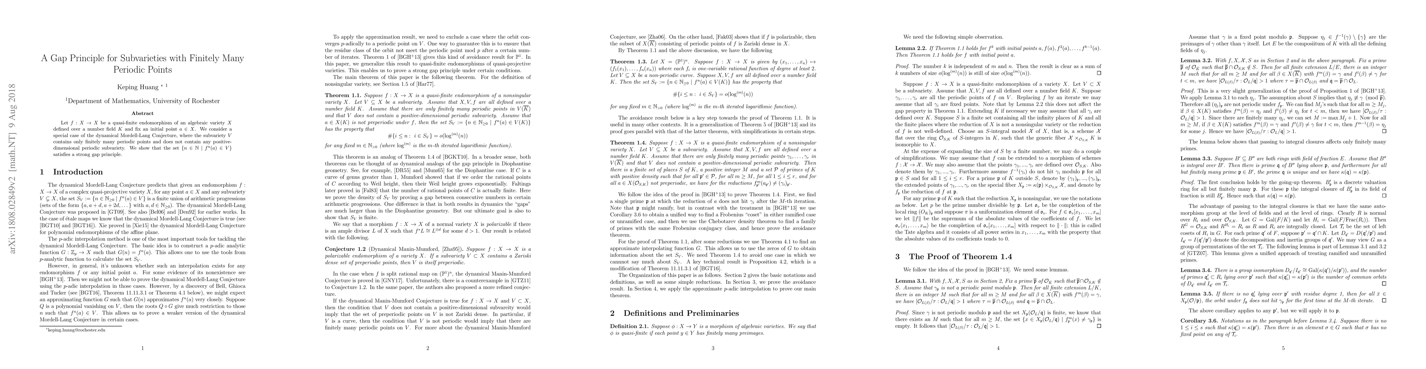 This paper proves a strong gap principle for the set of iterates of a point under a quasi-finite endomorphism of an algebraic variety, where the subvariety in question contains only finitely many periodic points and no positive-dimensional periodic subvariety. The result supports a special case of the dynamical Mordell-Lang Conjecture.