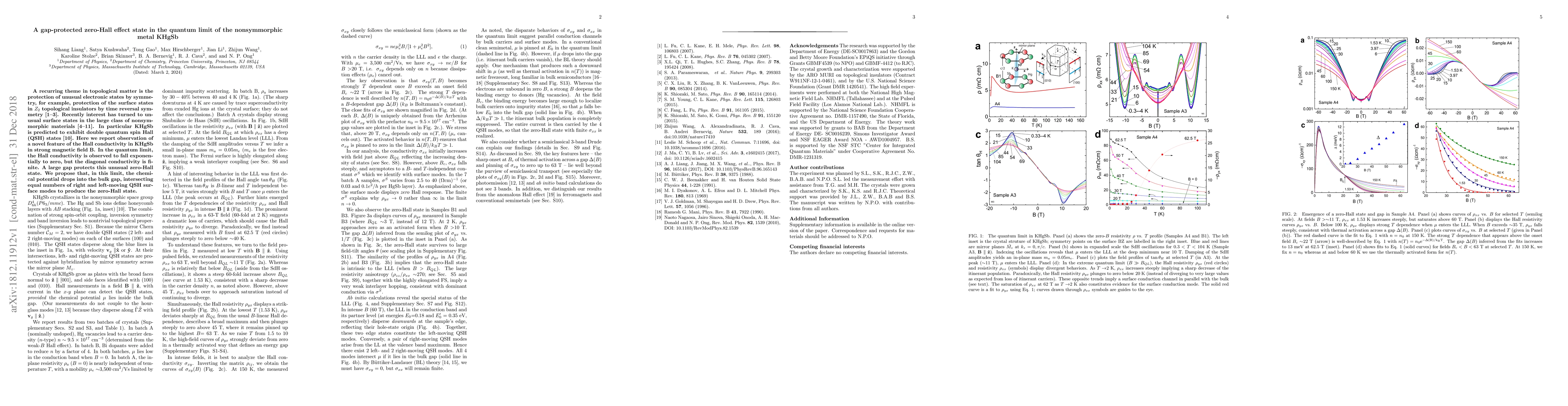 This paper reports the discovery of a gap-protected zero-Hall effect state in the quantum limit of the nonsymmorphic metal KHgSb, where the Hall conductivity drops to zero while the diagonal conductivity remains finite, suggesting a unique electronic behavior protected by a large gap.