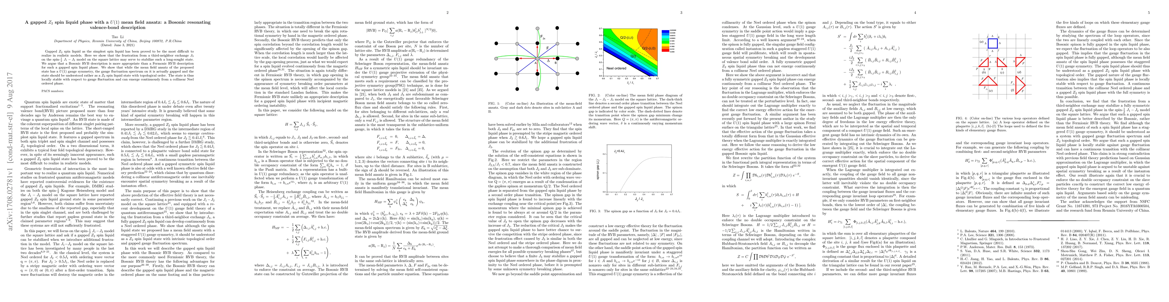 Gapped $Z_{2}$ spin liquid as the simplest spin liquid has been proved to be the most difficult to realize in realistic models. Here we show that the frustration from a third-neighbor exchange $J_{3}$ on the spin-$\frac{1}{2}$ $J_{1}-J_{2}$ model on the square lattice may serve to stabilize such a long-sought state. We argue that a Bosonic RVB description is more appropriate than a Fermonic RVB description for such a gapped spin liquid phase. We show that while the mean field ansatz of the proposed state has a $U(1)$ gauge symmetry, the gauge fluctuation spectrum on it is actually gapped and the state should be understood rather as a $Z_{2}$ spin liquid state with topological order. The state is thus locally stable with respect to gauge fluctuation and can emerge continuously from a collinear Neel ordered phase.