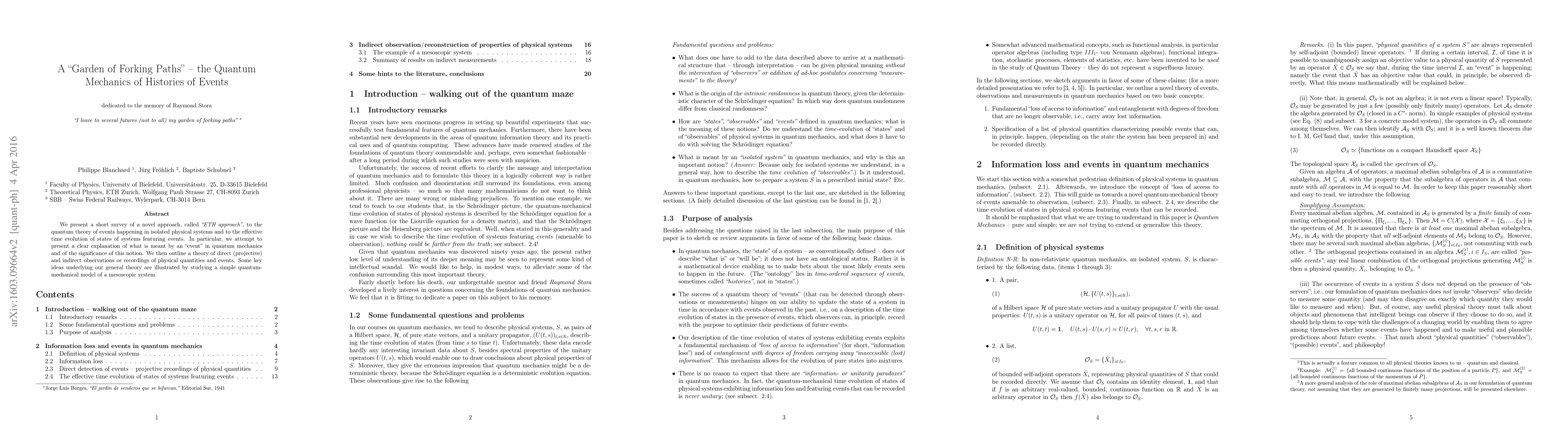 We present a short survey of a novel approach, called "ETH approach", to the quantum theory of events happening in isolated physical systems and to the effective time evolution of states of systems featuring events. In particular, we attempt to present a clear explanation of what is meant by an "event" in quantum mechanics and of the significance of this notion. We then outline a theory of direct (projective) and indirect observations or recordings of physical quantities and events. Some key ideas underlying our general theory are illustrated by studying a simple quantum-mechanical model of a mesoscopic system.
