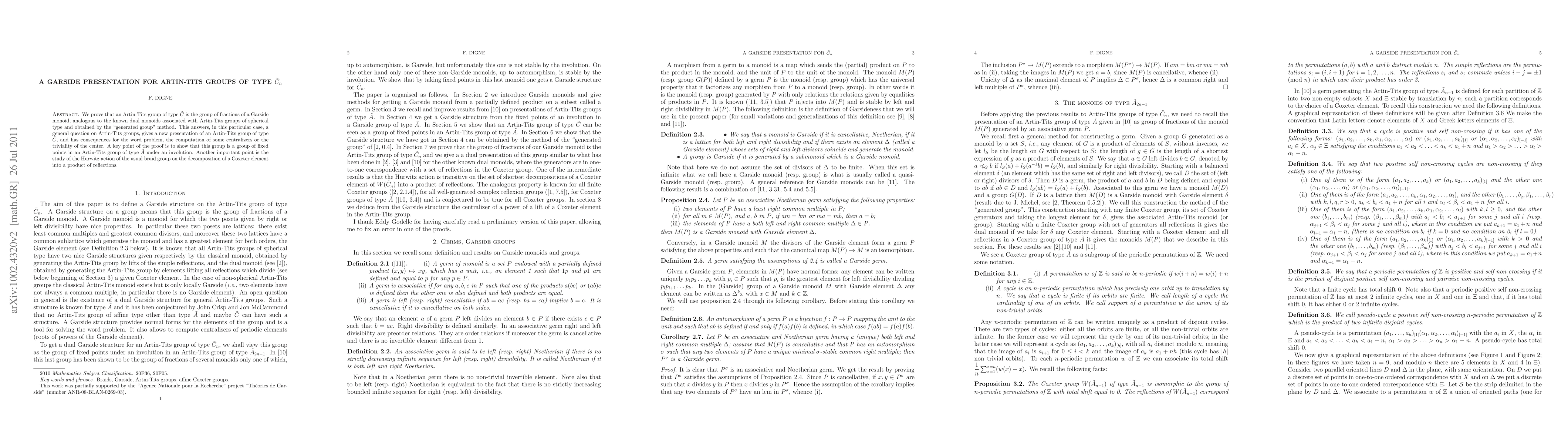 This paper proves that Artin-Tits groups of type $\tilde C_n$ are groups of fractions of a Garside monoid, providing a new Garside presentation. This resolves a specific question about these groups and has implications for the word problem, centralizers, and the center's triviality.