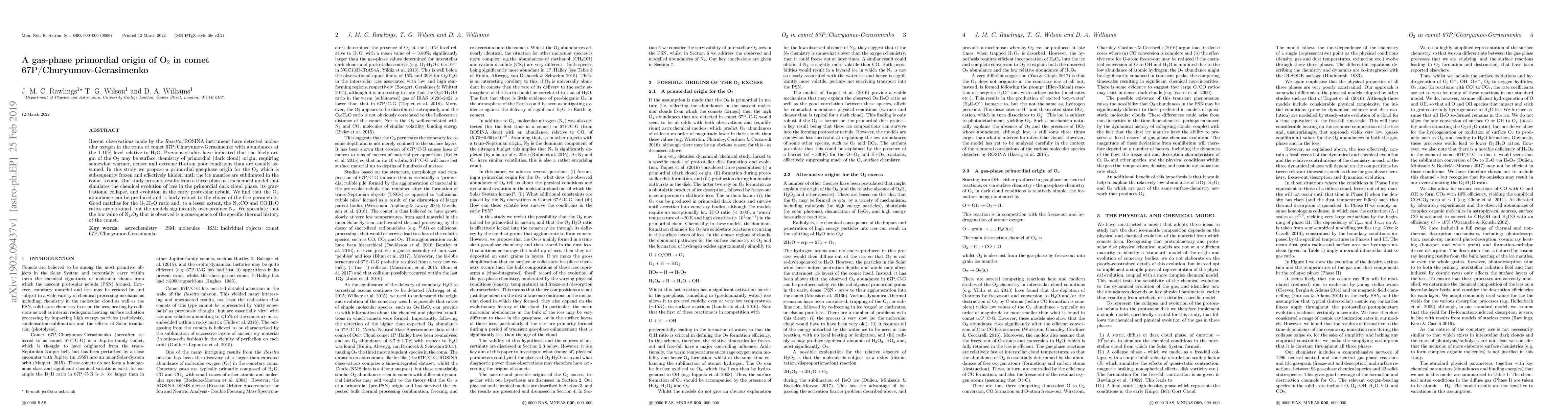 This study proposes a primordial gas-phase origin for molecular oxygen (O2) in comet 67P/Churyumov-Gerasimenko, suggesting it was produced in the early protosolar nebula and later trapped in ices. The research uses a three-phase astrochemical model to simulate the chemical evolution, finding good matches for O2:H2O ratios but over-producing nitrogen.