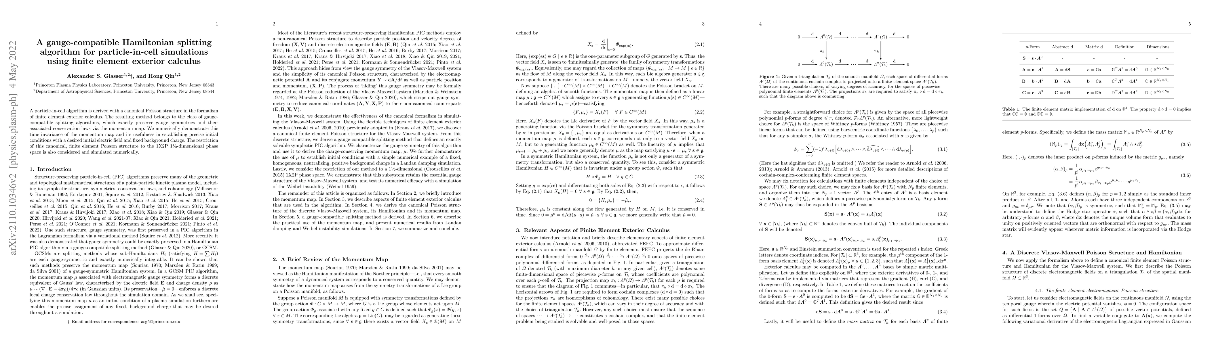 The paper presents a novel gauge-compatible Hamiltonian splitting algorithm for particle-in-cell simulations using finite element exterior calculus, ensuring exact preservation of gauge symmetries and conservation laws.