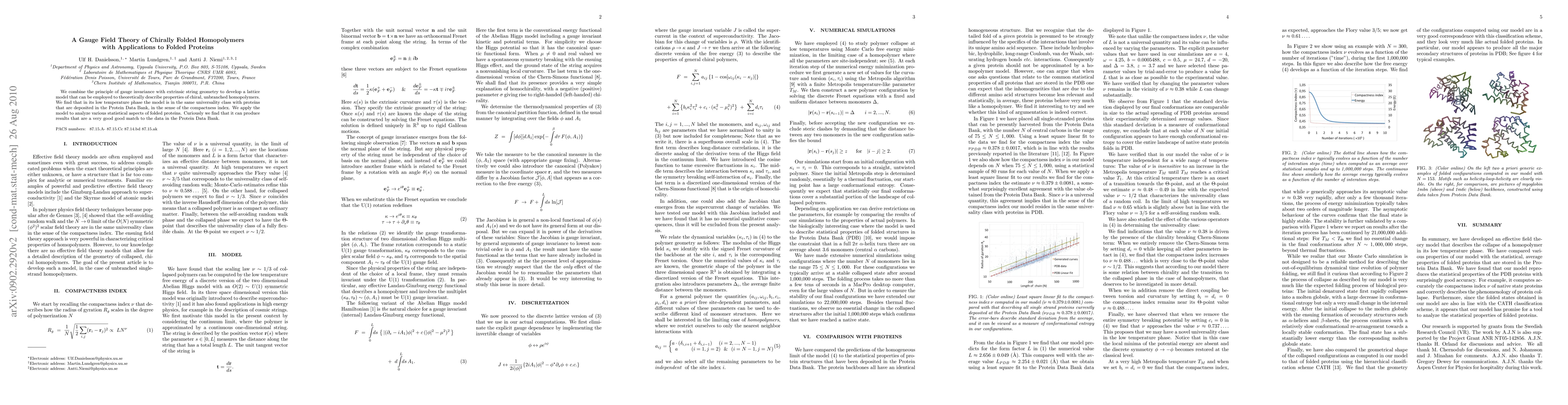 We combine the principle of gauge invariance with extrinsic string geometry to develop a lattice model that can be employed to theoretically describe properties of chiral, unbranched homopolymers. We find that in its low temperature phase the model is in the same universality class with proteins that are deposited in the Protein Data Bank, in the sense of the compactness index. We apply the model to analyze various statistical aspects of folded proteins. Curiously we find that it can produce results that are a very good good match to the data in the Protein Data Bank.