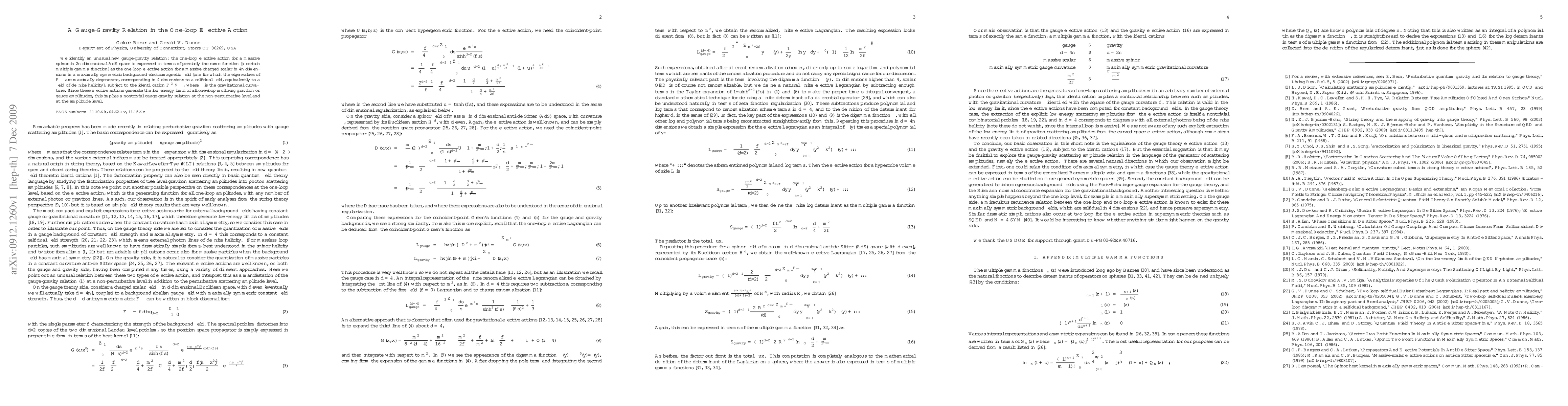 We identify an unusual new gauge-gravity relation: the one-loop effective action for a massive spinor in 2n dimensional AdS space is expressed in terms of precisely the same function [a certain multiple gamma function] as the one-loop effective action for a massive charged scalar in 4n dimensions in a maximally symmetric background electromagnetic field [one for which the eigenvalues of F_{\mu\nu} are maximally degenerate, corresponding in 4 dimensions to a self-dual field, equivalently to a field of definite helicity], subject to the identification F^2 <-> \Lambda, where \Lambda is the gravitational curvature. Since these effective actions generate the low energy limit of all one-loop multi-leg graviton or gauge amplitudes, this implies a nontrivial gauge-gravity relation at the non-perturbative level and at the amplitude level.