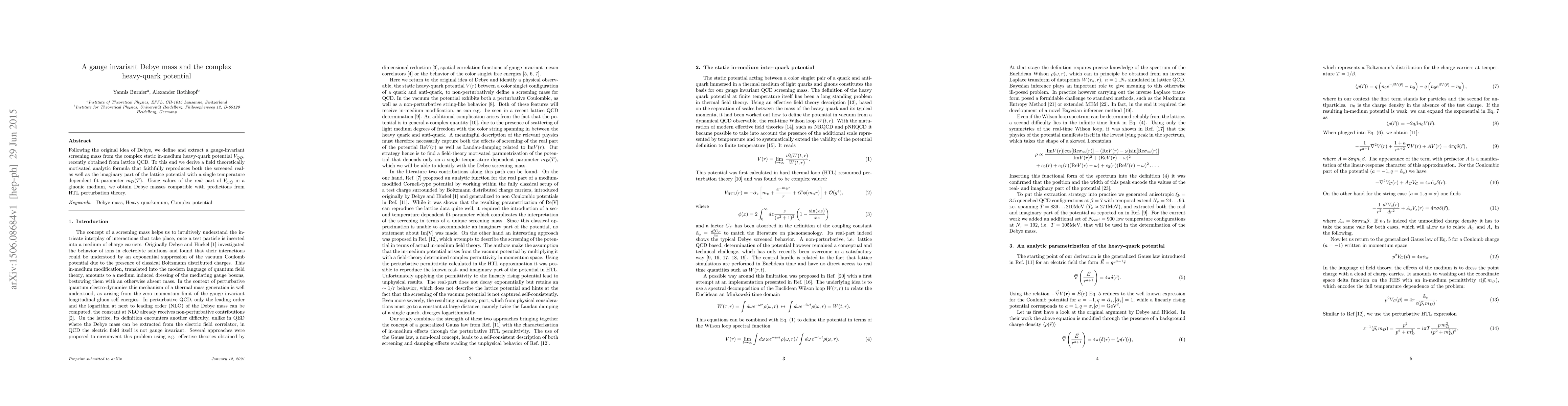 This paper defines a gauge-invariant Debye mass from the complex static in-medium heavy-quark potential obtained via lattice QCD, using a field-theoretically motivated formula. The derived mass is consistent with predictions from HTL perturbation theory.