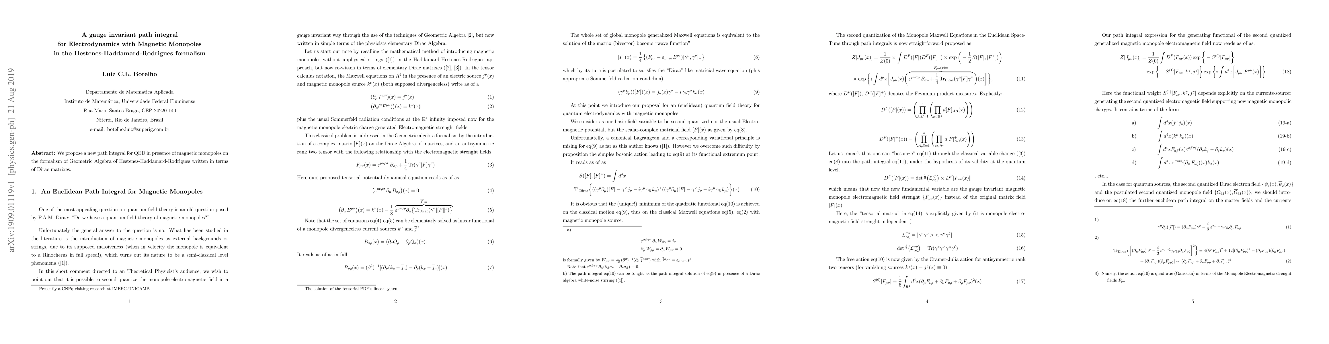 Summary: This paper introduces a gauge invariant path integral formulation for quantum electrodynamics (QED) with magnetic monopoles, utilizing the Geometric Algebra framework of Hestenes-Haddamard-Rodrigues expressed through Dirac matrices. The approach aims to provide a new perspective on the theoretical treatment of QED in the presence of magnetic monopoles.