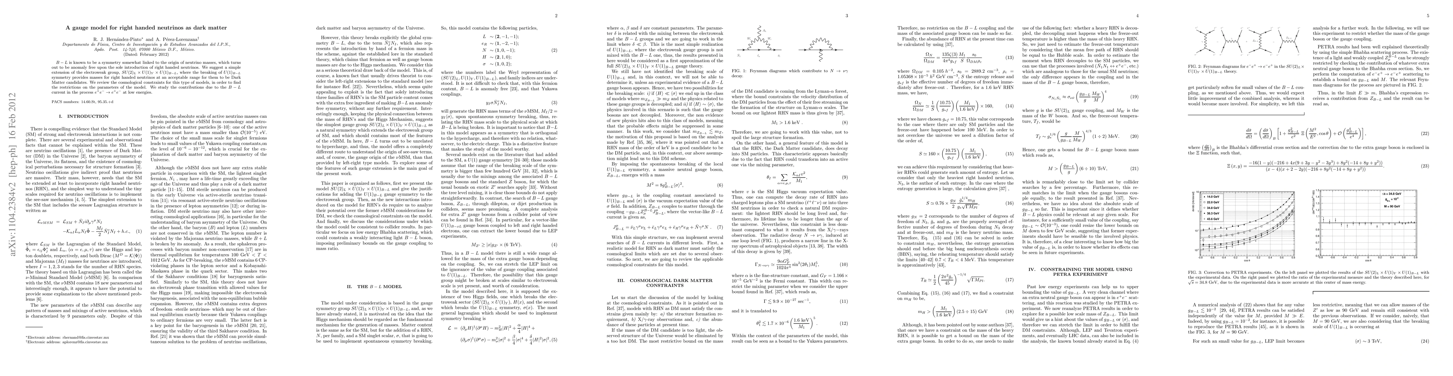This paper proposes a gauge model extending the electroweak group to include $U(1)_{B-L}$ symmetry, which naturally incorporates right handed neutrinos and allows their mass generation suitable for dark matter. It examines cosmological constraints and low-energy processes to determine model parameter restrictions.