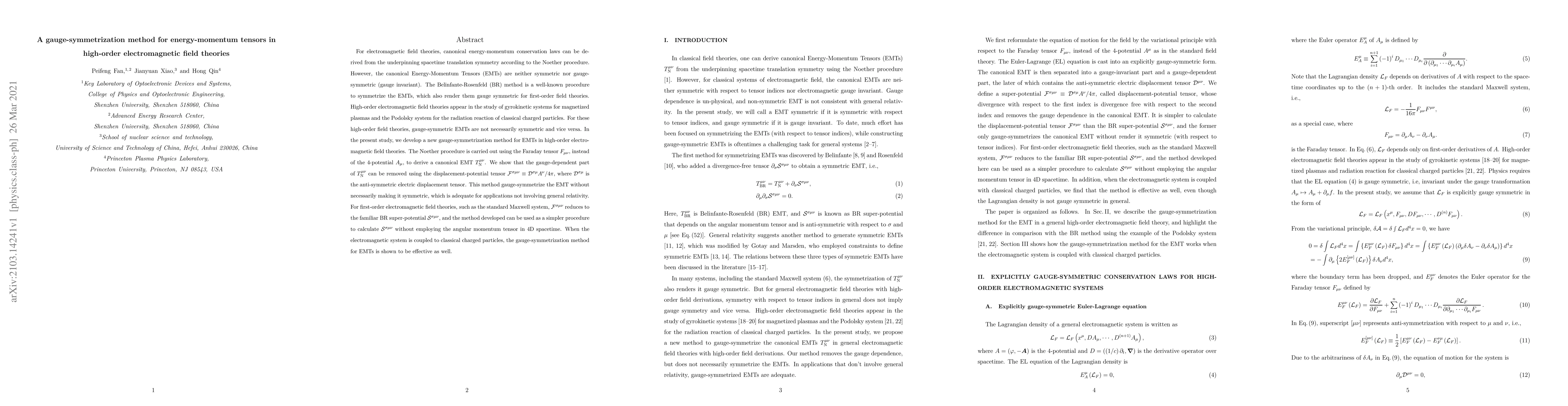 For electromagnetic field theories, canonical energy-momentum conservation laws can be derived from the underpinning spacetime translation symmetry according to the Noether procedure. However, the canonical Energy-Momentum Tensors (EMTs) are neither symmetric nor gauge-symmetric (gauge invariant). The Belinfante-Rosenfeld (BR) method is a well-known procedure to symmetrize the EMTs, which also renders them gauge symmetric for first-order field theories. High-order electromagnetic field theories appear in the study of gyrokinetic systems for magnetized plasmas and the Podolsky system for the radiation reaction of classical charged particles. For these high-order field theories, gauge-symmetric EMTs are not necessarily symmetric and vice versa. In the present study, we develop a new gauge-symmetrization method for EMTs in high-order electromagnetic field theories. The Noether procedure is carried out using the Faraday tensor F, instead of the 4-potential A, to derive a canonical EMT T_N. We show that the gauge-dependent part of T_N can be removed using the displacement-potential tensor \mathcal{F}=\mathcal{D}*A/4\pi, where \mathcal{D} is the anti-symmetric electric displacement tensor. This method gauge-symmetrize the EMT without necessarily making it symmetric, which is adequate for applications not involving general relativity. For first-order electromagnetic field theories, such as the standard Maxwell system, \mathcal{F} reduces to the familiar BR super-potential \mathcal{S}, and the method developed can be used as a simpler procedure to calculate \mathcal{S} without employing the angular momentum tensor in 4D spacetime. When the electromagnetic system is coupled to classical charged particles, the gauge-symmetrization method for EMTs is shown to be effective as well.