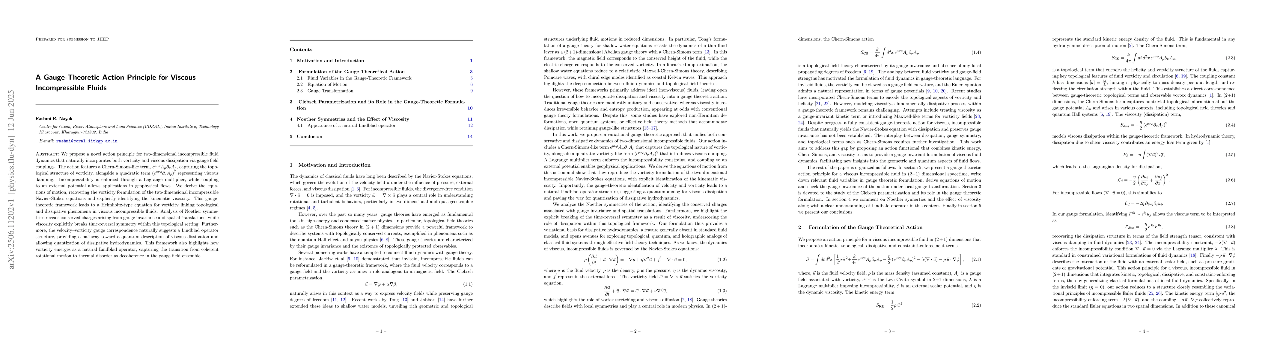 We propose a novel action principle for two dimensional incompressible fluid dynamics that naturally incorporates both vorticity and viscous dissipation via gauge field couplings. The action features a Chern Simons like term, $\epsilon^{\mu\nu\rho} A_\mu \partial_\nu A_\rho$, capturing the topological structure of vorticity, alongside a quadratic term $(\epsilon^{\mu\nu\rho} \partial_\nu A_\rho)^2$ representing viscous damping. Incompressibility is enforced through a Lagrange multiplier, while coupling to an external potential allows applications in geophysical flows. We derive the equations of motion, recovering the vorticity formulation of the two-dimensional incompressible Navier Stokes equations and explicitly identifying the kinematic viscosity. This gauge theoretic framework leads to a Helmholtz type equation for vorticity linking topological and dissipative phenomena in viscous incompressible fluids. Analysis of Noether symmetries reveals conserved charges arising from gauge invariance and spatial translations, while viscosity explicitly breaks time reversal symmetry within this topological setting. Furthermore, the velocity vorticity gauge correspondence naturally suggests a Lindblad operator structure, providing a pathway toward a quantum description of viscous dissipation and allowing quantization of dissipative hydrodynamics. This framework also highlights how vorticity emerges as a natural Lindblad operator, capturing the transition from coherent rotational motion to thermal disorder as decoherence in the gauge field ensemble.