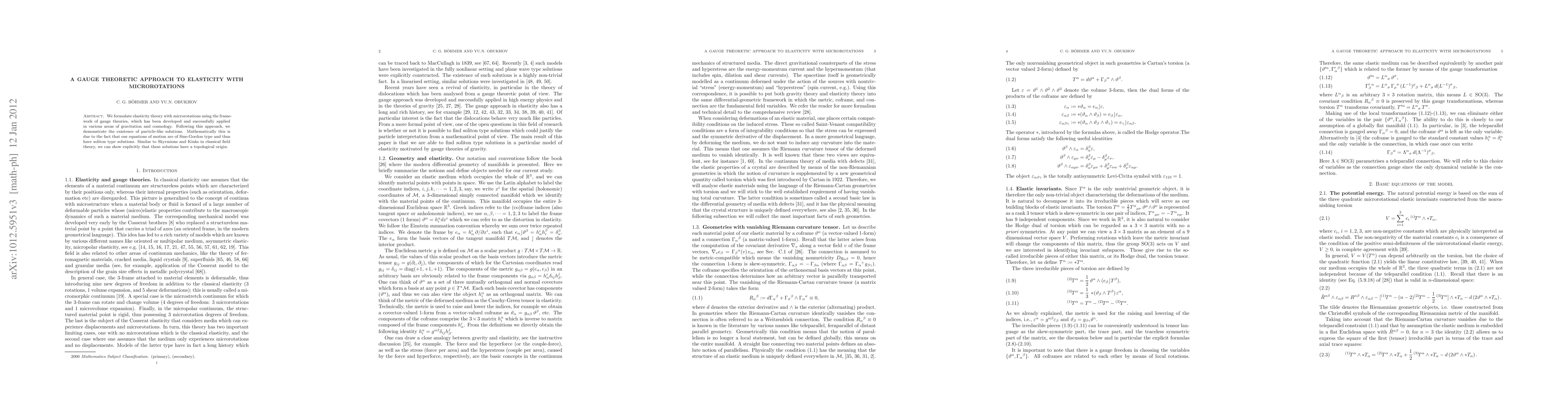 We formulate elasticity theory with microrotations using the framework of gauge theories, which has been developed and successfully applied in various areas of gravitation and cosmology. Following this approach, we demonstrate the existence of particle-like solutions. Mathematically this is due to the fact that our equations of motion are of Sine-Gordon type and thus have soliton type solutions. Similar to Skyrmions and Kinks in classical field theory, we can show explicitly that these solutions have a topological origin.