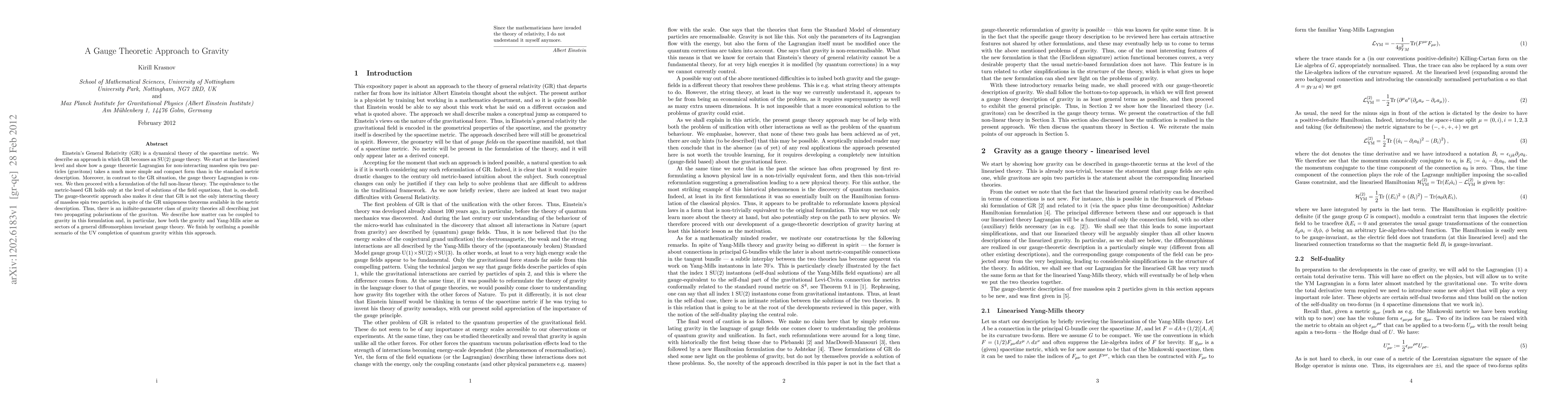Einstein's General Relativity (GR) is a dynamical theory of the spacetime metric. We describe an approach in which GR becomes an SU(2) gauge theory. We start at the linearised level and show how a gauge theoretic Lagrangian for non-interacting massless spin two particles (gravitons) takes a much more simple and compact form than in the standard metric description. Moreover, in contrast to the GR situation, the gauge theory Lagrangian is convex. We then proceed with a formulation of the full non-linear theory. The equivalence to the metric-based GR holds only at the level of solutions of the field equations, that is, on-shell. The gauge-theoretic approach also makes it clear that GR is not the only interacting theory of massless spin two particles, in spite of the GR uniqueness theorems available in the metric description. Thus, there is an inifnite-parameter class of gravity theories all describing just two propagating polarisations of the graviton. We describe how matter can be coupled to gravity in this formulation and, in particular, how both the gravity and Yang-Mills arise as sectors of a general diffeomorphism invariant gauge theory. We finish by outlining a possible scenario of the UV completion of quantum gravity within this approach.