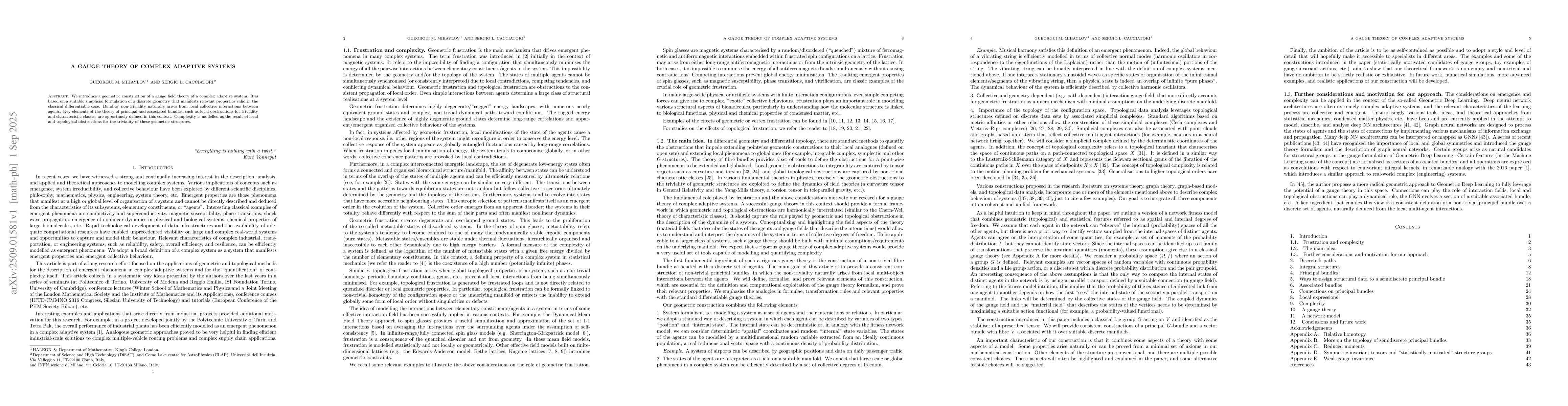 We introduce a geometric construction of a gauge field theory of a complex adaptive system. It is based on a suitable simplicial formulation of a discrete geometry that manifests relevant properties valid in the classical differentiable case. Bundles' non-triviality naturally arises from local collective interactions between agents. Key elements of the theory of principal and associated bundles, such as local obstructions for triviality and characteristic classes, are opportunely defined in this context. Complexity is modelled as the result of local and topological obstructions for the triviality of these geometric structures.