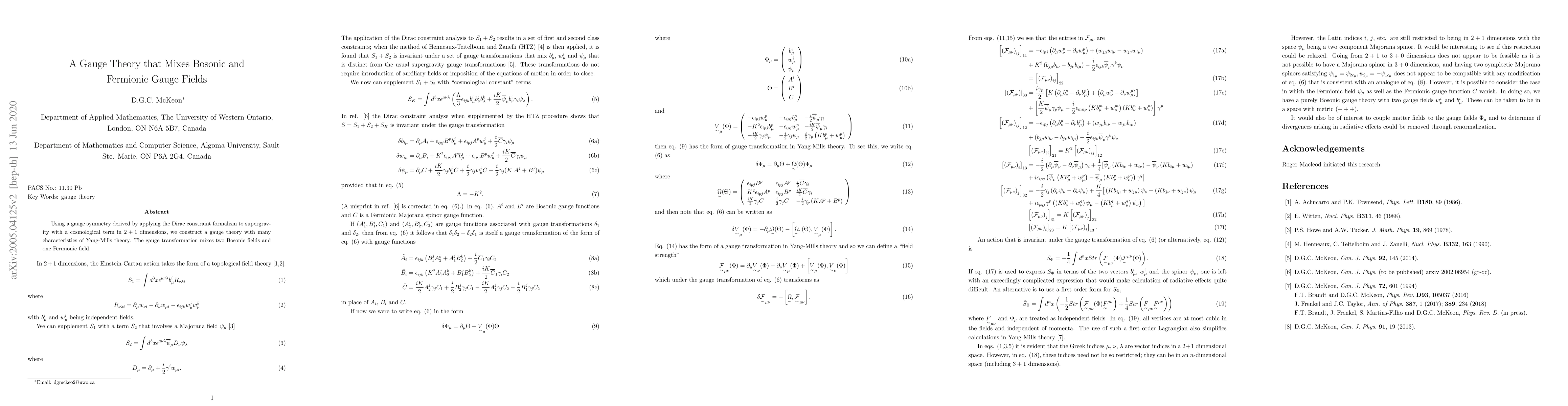 This paper constructs a gauge theory in 2+1 dimensions that combines bosonic and fermionic fields using a gauge symmetry derived from the Dirac constraint formalism applied to supergravity with a cosmological term. The gauge transformations in this theory mix two bosonic fields with one fermionic field.