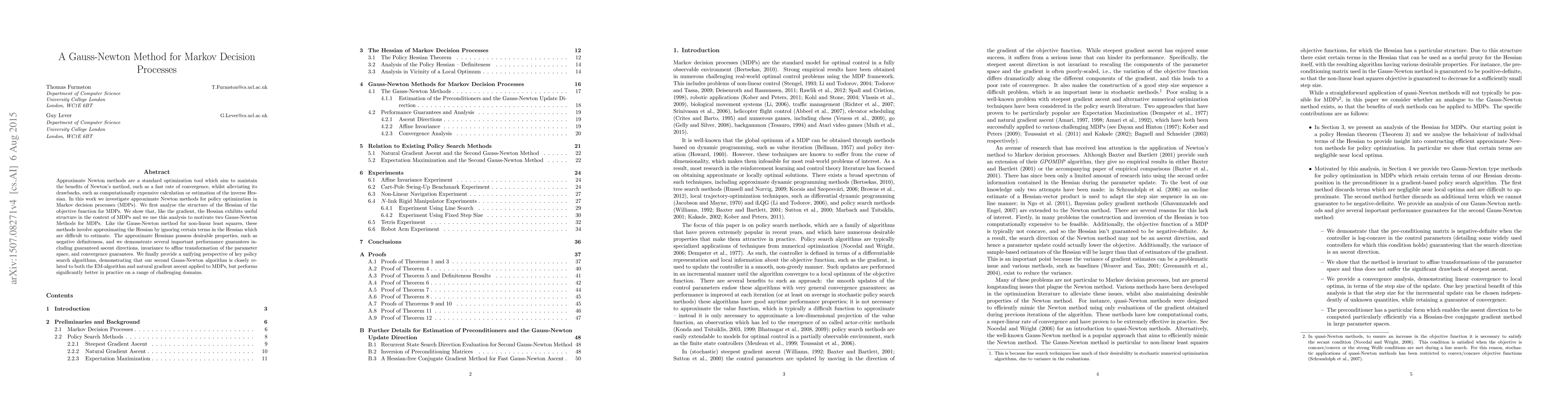 This paper proposes two Gauss-Newton methods for optimizing policies in Markov Decision Processes (MDPs) by approximating the Hessian to achieve fast convergence while reducing computational costs. The methods demonstrate desirable properties and outperform existing algorithms in practical applications.