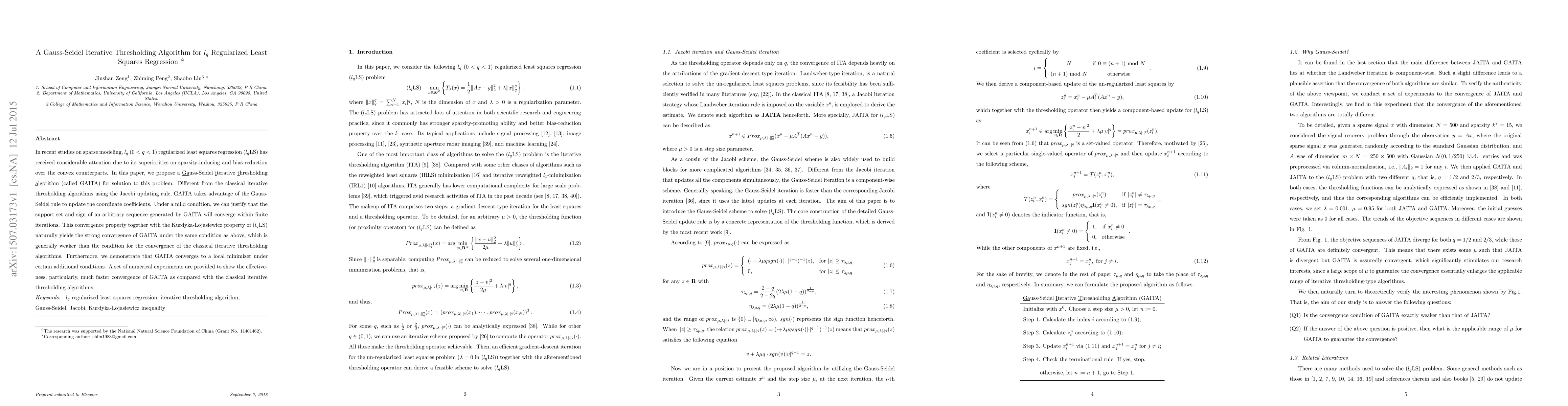 This paper proposes a Gauss-Seidel iterative thresholding algorithm (GAITA) for solving $l_q$ regularized least squares regression, which converges faster than classical Jacobi-based algorithms. The method leverages the Gauss-Seidel rule for updating coefficients and demonstrates strong convergence under milder conditions.