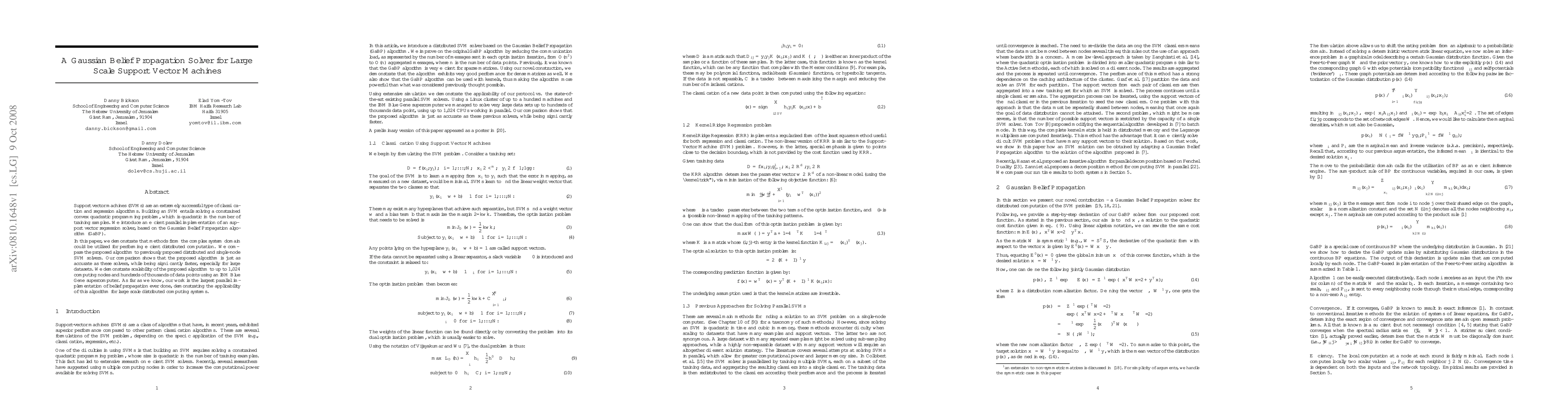 This paper presents a parallel Gaussian Belief Propagation (GaBP) solver for large-scale support vector machines (SVMs), demonstrating its scalability and efficiency on an IBM Blue Gene supercomputer. The proposed method is shown to be as accurate as existing solvers but significantly faster, especially for large datasets.