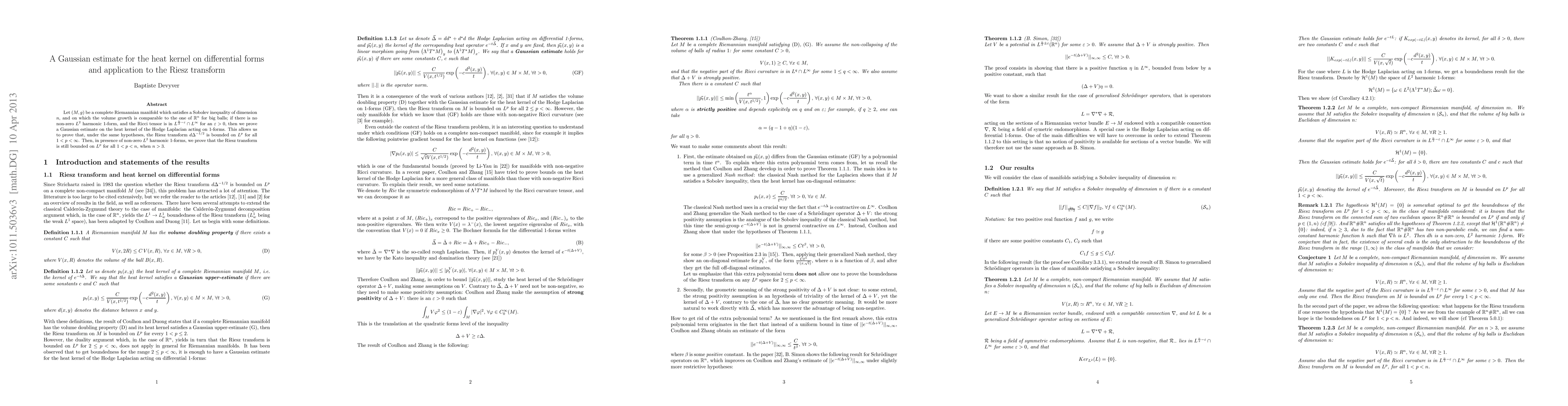 This paper proves a Gaussian estimate for the heat kernel on 1-forms on a complete Riemannian manifold with specific geometric properties, enabling the demonstration that the Riesz transform is bounded on $L^p$ spaces under these conditions.