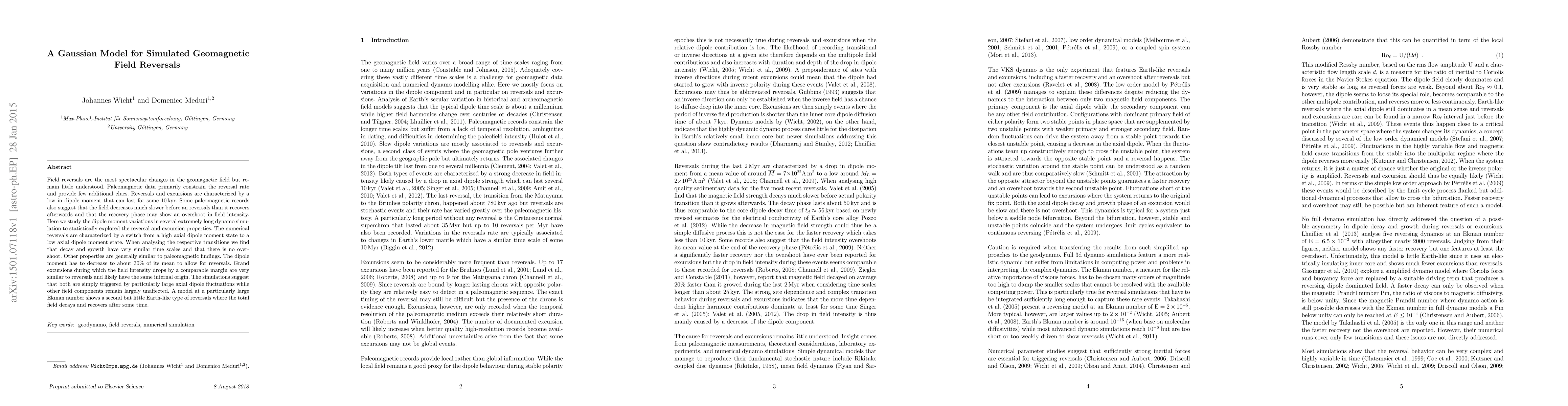 Researchers developed a Gaussian model to simulate geomagnetic field reversals, finding that large axial dipole fluctuations trigger both reversals and grand excursions, with similar time scales and properties.