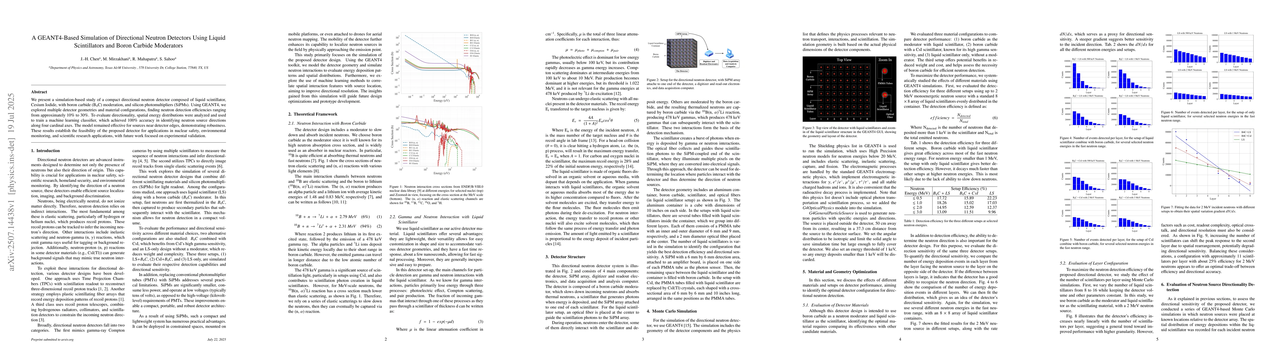We present a simulation-based study of a compact directional neutron detector composed of liquid scintillator, Cesium Iodide, with boron carbide (B4C) moderation, and silicon photomultipliers (SiPMs). Using GEANT4, we explored multiple detector geometries and material configurations, finding neutron detection efficiencies ranging from approximately 10% to 30%. To evaluate directionality, spatial energy distributions were analyzed and used to train a machine learning classifier, which achieved 100% accuracy in identifying neutron source directions along four cardinal axes. The model remained effective for sources near detector edges, demonstrating robustness. These results establish the feasibility of the proposed detector for applications in nuclear safety, environmental monitoring, and scientific research applications, with future work focused on experimental validation.