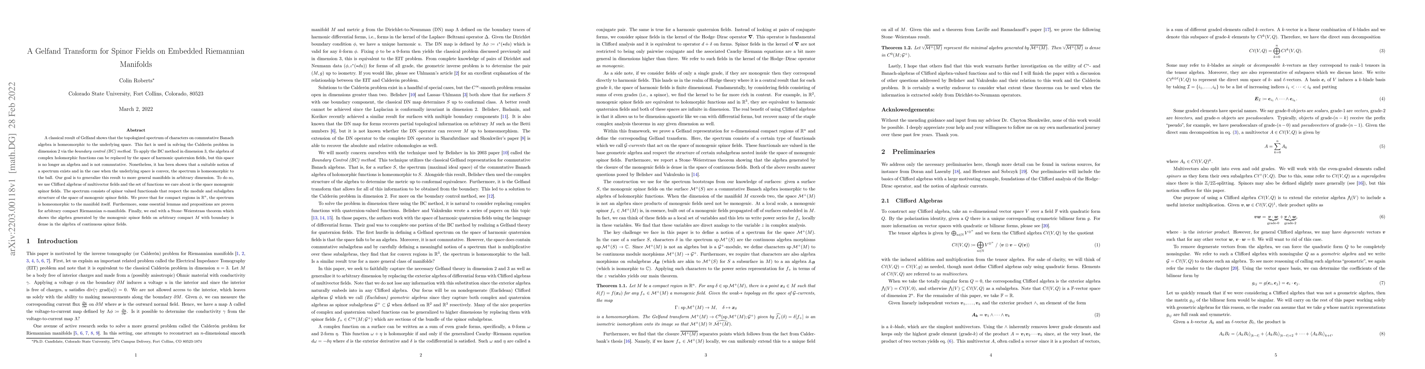 Researchers develop a Gelfand transform for spinor fields on embedded Riemannian manifolds, showing that the spectrum of these fields is homeomorphic to the manifold itself, with implications for solving problems in dimension 3 and beyond.