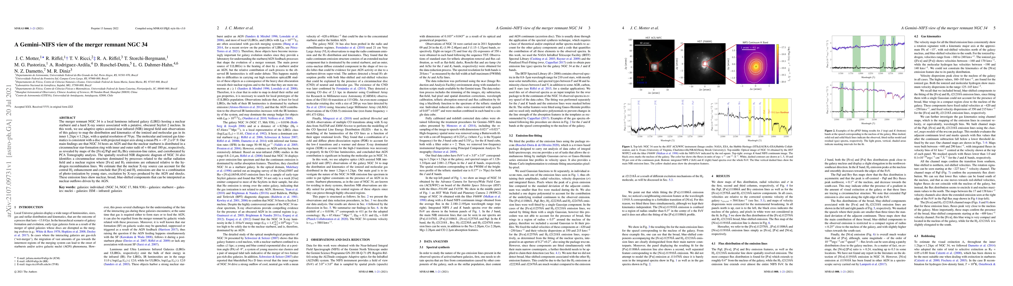 The merger remnant NGC 34 is a local luminous infrared galaxy (LIRG) hosting a nuclear starburst and a hard X-ray source associated with a putative, obscured Seyfert~2 nucleus. In this work, we use adaptive optics assisted near infrared (NIR) integral field unit observations of this galaxy to map the distribution and kinematics of the ionized and molecular gas in its inner $\mathrm{1.2\,kpc \times 1.2\,kpc}$, with a spatial resolution of 70~pc. The molecular and ionized gas kinematics is consistent with a disc with projected major axis along a mean PA~=~$\mathrm{-9^{\circ}.2 \pm 0^{\circ}.9}$. Our main findings are that NGC~34 hosts an AGN and that the nuclear starburst is distributed in a circumnuclear star-formation ring with inner and outer radii of $\approx$~60 and 180~pc, respectively, as revealed by maps of the $\mathrm{[Fe II] / Pa\beta}$ and $\mathrm{H_{2} / Br\gamma}$ emission-line ratios, and corroborated by PCA Tomography analysis. The spatially resolved NIR diagnostic diagram of NGC~34 also identifies a circumnuclear structure dominated by processes related to the stellar radiation field and a nuclear region where $[Fe II]$ and H$_2$ emissions are enhanced relative to the hydrogen recombination lines. We estimate that the nuclear X-ray source can account for the central H$_2$ enhancement and conclude that $[Fe II]$ and H$_2$ emissions are due to a combination of photo-ionization by young stars, excitation by X-rays produced by the AGN and shocks. These emission lines show nuclear, broad, blue-shifted components that can be interpreted as nuclear outflows driven by the AGN.