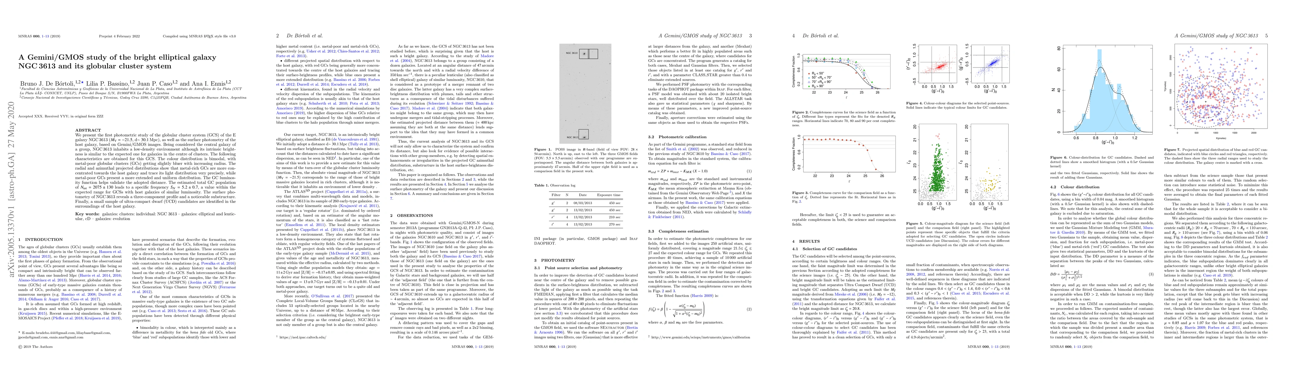We present the first photometric study of the globular cluster system (GCS) of the E galaxy NGC 3613 (Mv = -21.5, d = 30.1 Mpc), as well as the surface photometry of the host galaxy, based on Gemini/GMOS images. Being considered the central galaxy of a group, NGC 3613 inhabits a low-density environment although its intrinsic brightness is similar to the expected one for galaxies in the centre of clusters. The following characteristics are obtained for this GCS. The colour distribution is bimodal, with metal-poor globular clusters (GCs) getting slightly bluer with increasing radius. The radial and azimuthal projected distributions show that metal-rich GCs are more concentrated towards the host galaxy and trace its light distribution very precisely, while metal-poor GCs present a more extended and uniform distribution. The GC luminosity function helps validate the adopted distance. The estimated total GC population of Ntot= 2075 +/- 130 leads to a specific frequency Sn=5.2 +/- 0.7, a value within the expected range for GCSs with host galaxies of similar luminosity. The surface photometry of NGC 3613 reveals a three-component profile and a noticeable substructure. Finally, a small sample of ultra-compact dwarf (UCD) candidates are identified in the surroundings of the host galaxy.