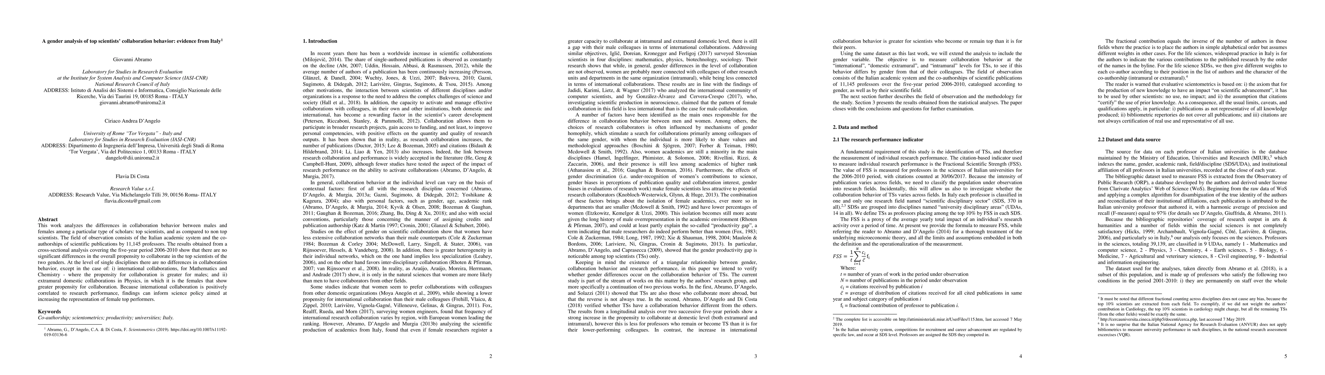 This study examines gender differences in collaboration behavior among top scientists in Italy, finding no significant overall differences. However, males show a greater propensity for international collaborations in Mathematics and Chemistry, while females exhibit a higher inclination for extramural domestic collaborations in Physics. These insights can guide science policy to enhance female representation among top research performers.