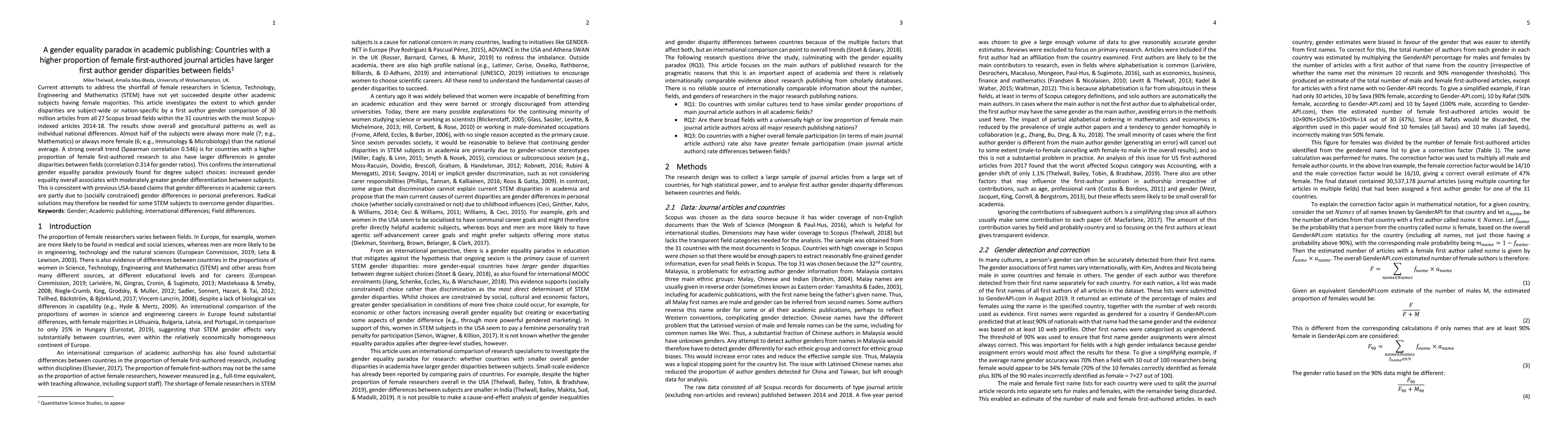 This paper reveals that countries with higher proportions of female first-author journal articles exhibit larger gender disparities in authorship across different fields, highlighting a paradox in gender equality in academic publishing. The findings suggest that increased gender equality overall may correlate with greater gender differentiation between fields, indicating that personal preferences and social constraints may be contributing factors.