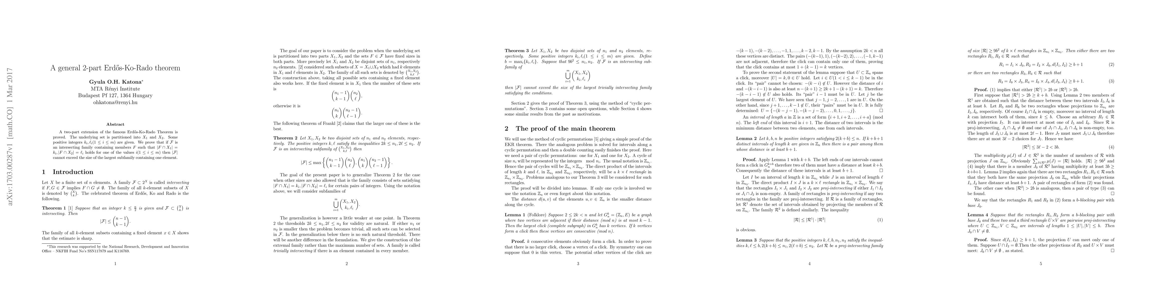 This paper proves a two-part extension of the Erdős-Ko-Rado Theorem, showing that intersecting families ${\cal F}$ of sets partitioned into $X_1$ and $X_2$ cannot exceed a certain size if they satisfy specific intersection conditions with $k_i$ and $\ell_i$ elements in $X_1$ and $X_2$ respectively. The result generalizes the original theorem by considering multiple such conditions.