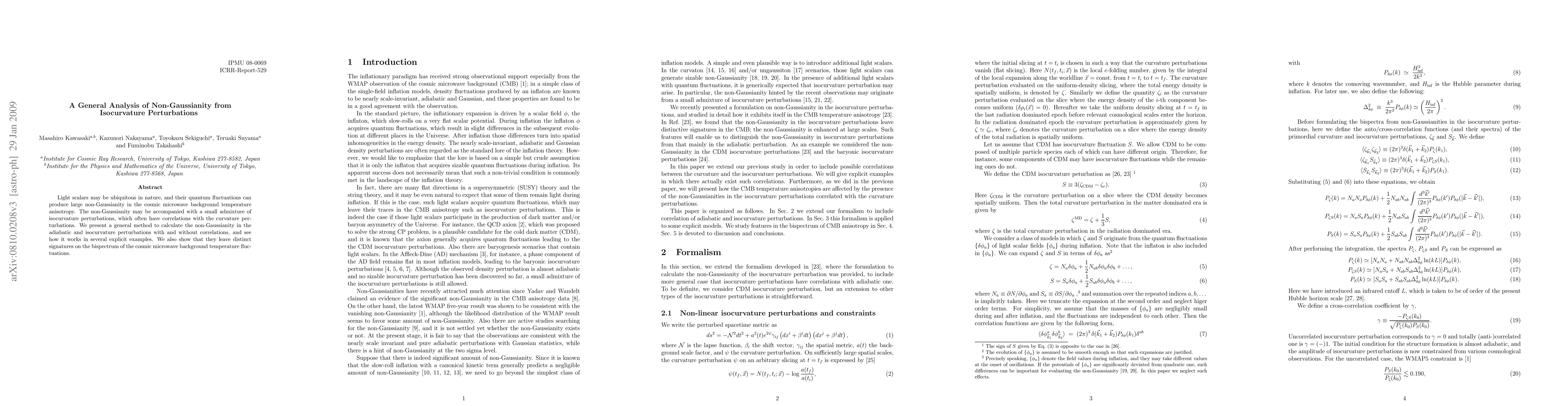 Light scalars may be ubiquitous in nature, and their quantum fluctuations can produce large non-Gaussianity in the cosmic microwave background temperature anisotropy. The non-Gaussianity may be accompanied with a small admixture of isocurvature perturbations, which often have correlations with the curvature perturbations. We present a general method to calculate the non-Gaussianity in the adiabatic and isocurvature perturbations with and without correlations, and see how it works in several explicit examples. We also show that they leave distinct signatures on the bispectrum of the cosmic microwave background temperature fluctuations.