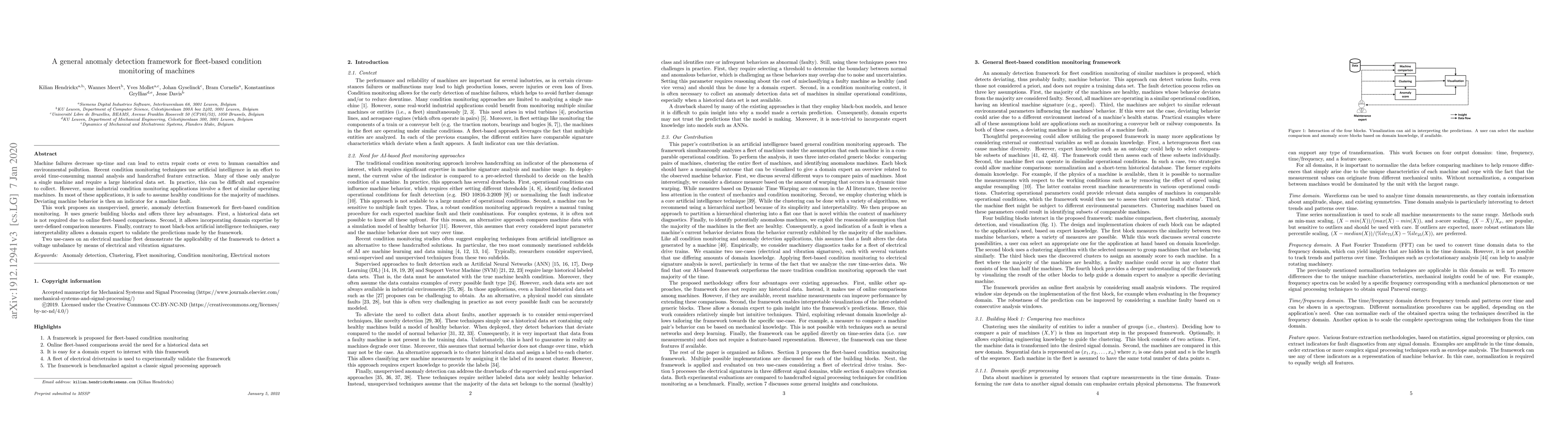 Machine failures decrease up-time and can lead to extra repair costs or even to human casualties and environmental pollution. Recent condition monitoring techniques use artificial intelligence in an effort to avoid time-consuming manual analysis and handcrafted feature extraction. Many of these only analyze a single machine and require a large historical data set. In practice, this can be difficult and expensive to collect. However, some industrial condition monitoring applications involve a fleet of similar operating machines. In most of these applications, it is safe to assume healthy conditions for the majority of machines. Deviating machine behavior is then an indicator for a machine fault. This work proposes an unsupervised, generic, anomaly detection framework for fleet-based condition monitoring. It uses generic building blocks and offers three key advantages. First, a historical data set is not required due to online fleet-based comparisons. Second, it allows incorporating domain expertise by user-defined comparison measures. Finally, contrary to most black-box artificial intelligence techniques, easy interpretability allows a domain expert to validate the predictions made by the framework. Two use-cases on an electrical machine fleet demonstrate the applicability of the framework to detect a voltage unbalance by means of electrical and vibration signatures.