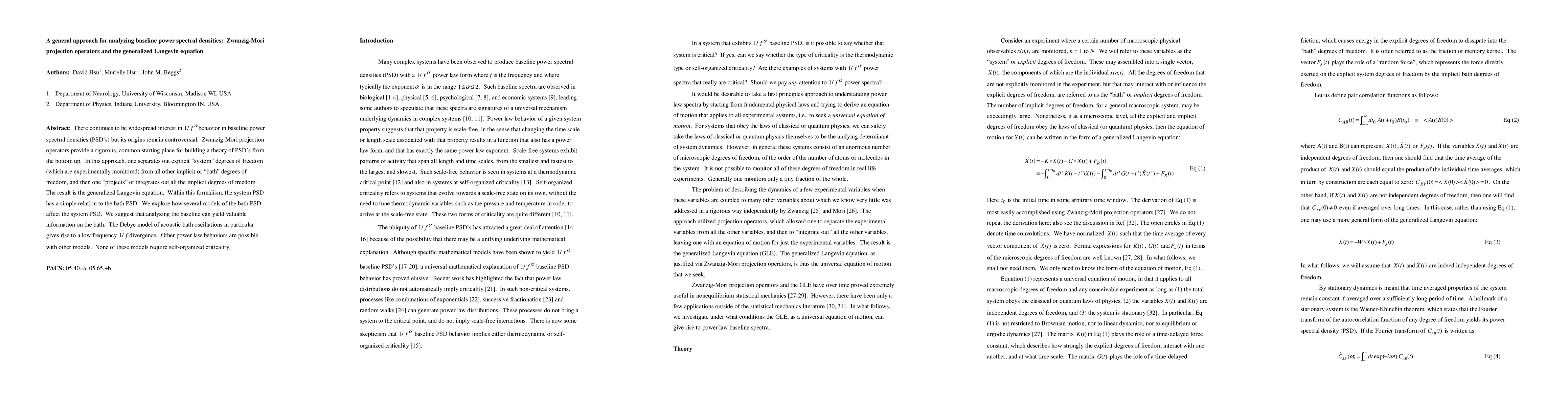 There continues to be widespread interest in 1/f^(alpha) behavior in baseline power spectral densities (PSD's) but its origins remain controversial. Zwanzig-Mori projection operators provide a rigorous, common starting place for building a theory of PSD's from the bottom up. In this approach, one separates out explicit "system" degrees of freedom (which are experimentally monitored) from all other implicit or "bath" degrees of freedom, and then one "projects" or integrates out all the implicit degrees of freedom. The result is the generalized Langevin equation. Within this formalism, the system PSD has a simple relation to the bath PSD. We explore how several models of the bath PSD affect the system PSD. We suggest that analyzing the baseline can yield valuable information on the bath. The Debye model of acoustic bath oscillations in particular gives rise to a low frequency 1/f divergence. Other power law behaviors are possible with other models. None of these models require self-organized criticality.