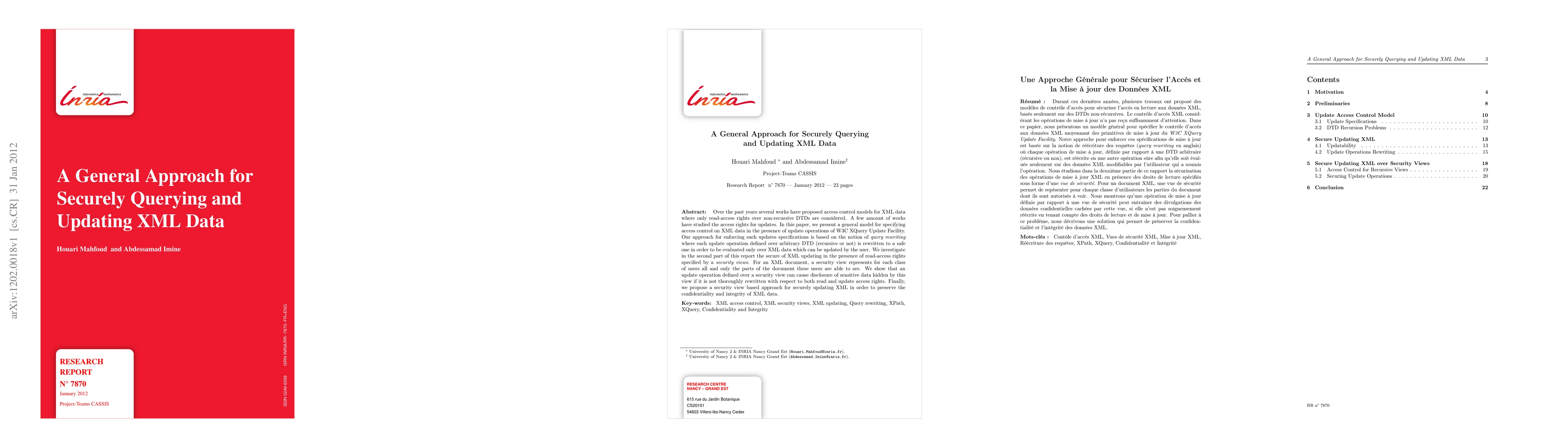 Over the past years several works have proposed access control models for XML data where only read-access rights over non-recursive DTDs are considered. A few amount of works have studied the access rights for updates. In this paper, we present a general model for specifying access control on XML data in the presence of update operations of W3C XQuery Update Facility. Our approach for enforcing such updates specifications is based on the notion of query rewriting where each update operation defined over arbitrary DTD (recursive or not) is rewritten to a safe one in order to be evaluated only over XML data which can be updated by the user. We investigate in the second part of this report the secure of XML updating in the presence of read-access rights specified by a security views. For an XML document, a security view represents for each class of users all and only the parts of the document these users are able to see. We show that an update operation defined over a security view can cause disclosure of sensitive data hidden by this view if it is not thoroughly rewritten with respect to both read and update access rights. Finally, we propose a security view based approach for securely updating XML in order to preserve the confidentiality and integrity of XML data.