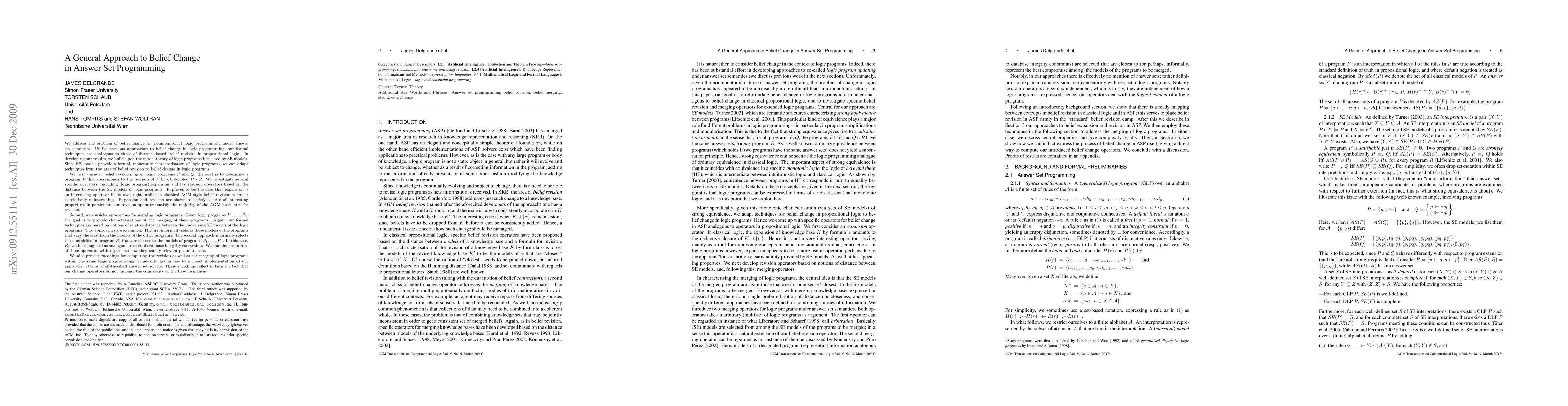 We address the problem of belief change in (nonmonotonic) logic programming under answer set semantics. Unlike previous approaches to belief change in logic programming, our formal techniques are analogous to those of distance-based belief revision in propositional logic. In developing our results, we build upon the model theory of logic programs furnished by SE models. Since SE models provide a formal, monotonic characterisation of logic programs, we can adapt techniques from the area of belief revision to belief change in logic programs. We introduce methods for revising and merging logic programs, respectively. For the former, we study both subset-based revision as well as cardinality-based revision, and we show that they satisfy the majority of the AGM postulates for revision. For merging, we consider operators following arbitration merging and IC merging, respectively. We also present encodings for computing the revision as well as the merging of logic programs within the same logic programming framework, giving rise to a direct implementation of our approach in terms of off-the-shelf answer set solvers. These encodings reflect in turn the fact that our change operators do not increase the complexity of the base formalism.