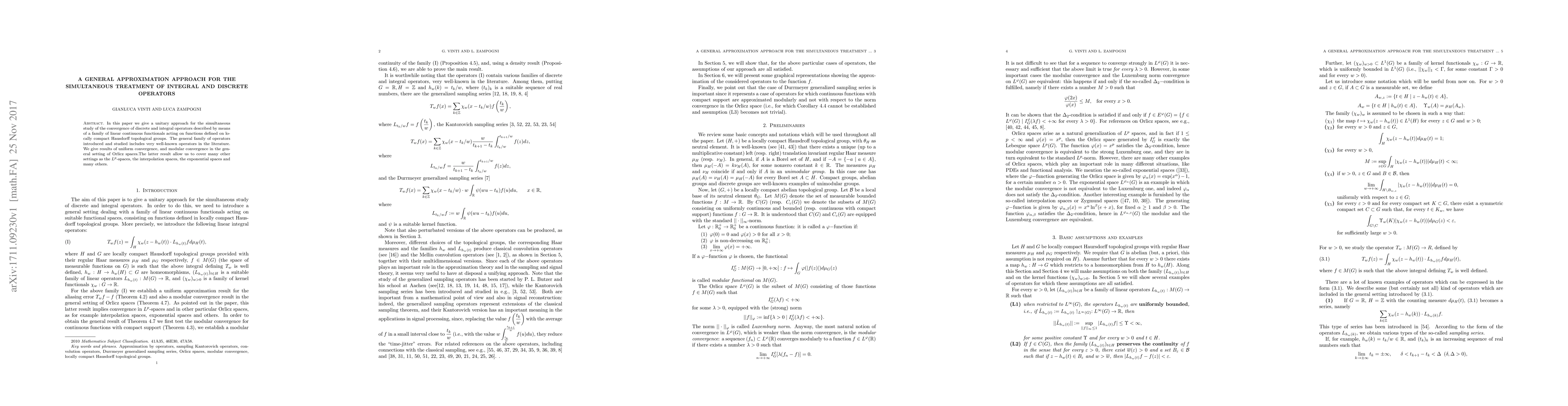 In this paper we give a unitary approach for the simultaneous study of the convergence of discrete and integral operators described by means of a family of linear continuous functionals acting on functions defined on locally compact Hausdorff topological groups. The general family of operators introduced and studied includes very well-known operators in the literature. We give results of uniform convergence, and modular convergence in the general setting of Orlicz spaces.The latter result allow us to cover many other settings as the $L^p$-spaces, the interpolation spaces, the exponential spaces and many others.