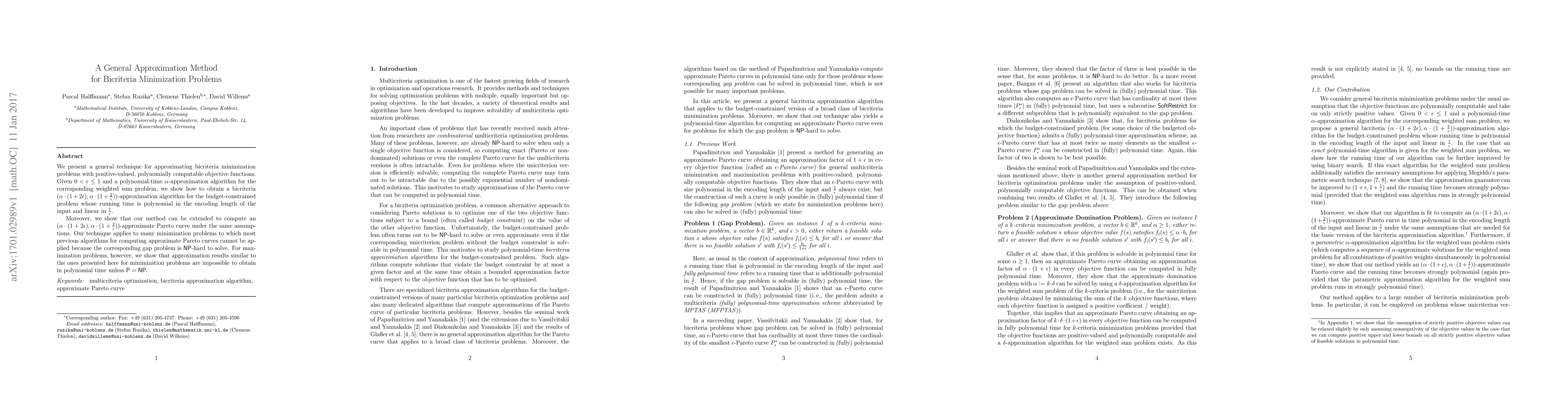We present a general technique for approximating bicriteria minimization problems with positive-valued, polynomially computable objective functions. Given $0<\epsilon\leq1$ and a polynomial-time $\alpha$-approximation algorithm for the corresponding weighted sum problem, we show how to obtain a bicriteria $(\alpha\cdot(1+2\epsilon),\alpha\cdot(1+\frac{2}{\epsilon}))$-approximation algorithm for the budget-constrained problem whose running time is polynomial in the encoding length of the input and linear in $\frac{1}{\epsilon}$. Moreover, we show that our method can be extended to compute an $(\alpha\cdot(1+2\epsilon),\alpha\cdot(1+\frac{2}{\epsilon}))$-approximate Pareto curve under the same assumptions. Our technique applies to many minimization problems to which most previous algorithms for computing approximate Pareto curves cannot be applied because the corresponding gap problem is $\textsf{NP}$-hard to solve. For maximization problems, however, we show that approximation results similar to the ones presented here for minimization problems are impossible to obtain in polynomial time unless $\textsf{P}=\textsf{NP}$.