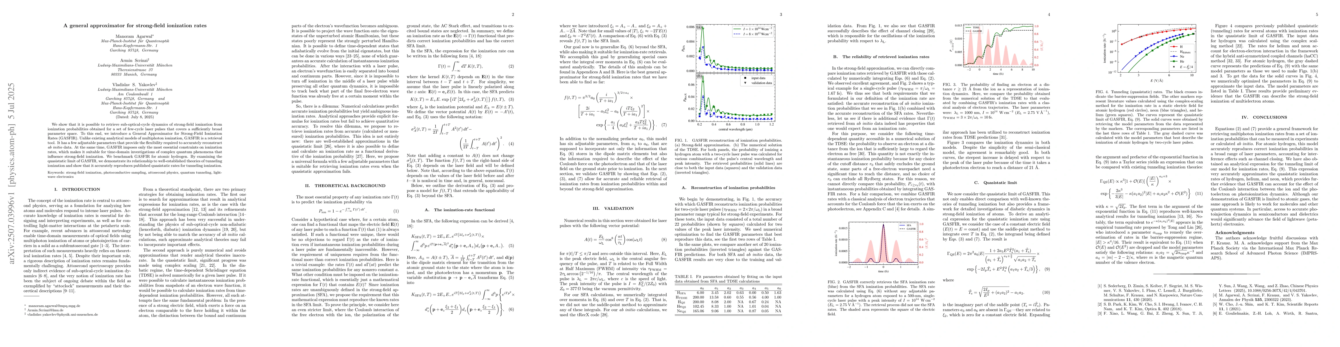 We show that it is possible to retrieve sub-optical-cycle dynamics of strong-field ionization from ionization probabilities obtained for a set of few-cycle laser pulses that covers a sufficiently broad parameter space. To this end, we introduce a General Approximator for Strong-Field Ionization Rates (GASFIR). Unlike existing analytical models of multiphoton ionization, GASFIR is a retrieval tool. It has a few adjustable parameters that provide the flexibility required to accurately reconstruct ab initio data. At the same time, GASFIR imposes only the most essential constraints on ionization rates, which makes it suitable for time-domain investigations of complex quantum phenomena that influence strong-field ionization. We benchmark GASFIR for atomic hydrogen. By examining the quasistatic limit of GASFIR, we demonstrate its relationship to well-established theories of tunneling ionization and show that it accurately reproduces published quasistatic rates for tunneling ionization.