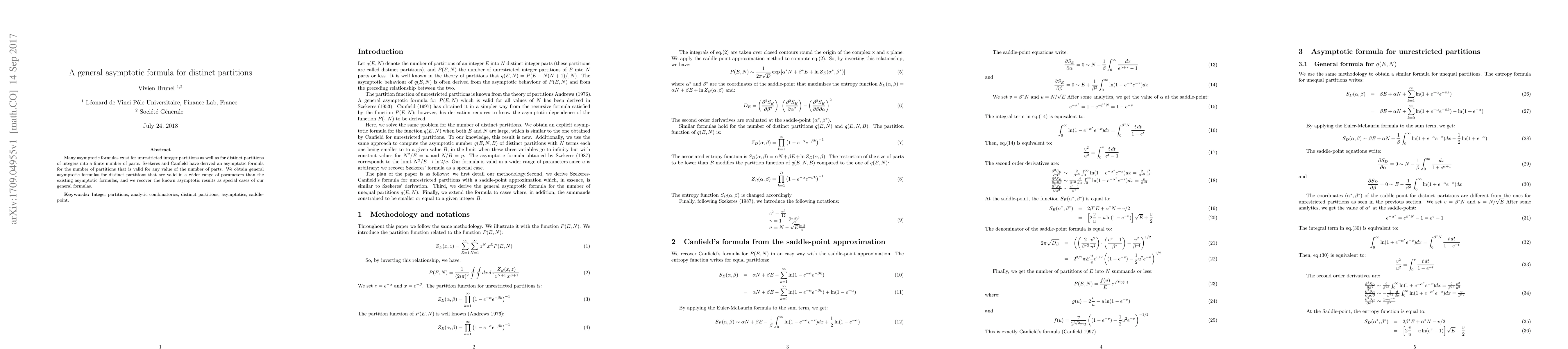 Many asymptotic formulas exist for unrestricted integer partitions as well as for distinct partitions of integers into a finite number of parts. Szekeres and Canfield have derived an asymptotic formula for the number of partitions that is valid for any value of the number of parts. We obtain general asymptotic formulas for distinct partitions that are valid in a wider range of parameters than the existing asymptotic formulas, and we recover the known asymptotic results as special cases of our general formulas.